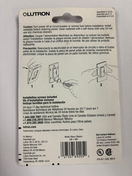 12 PK Lutron CW-1-WH Claro Screwless 1-Gang Wall Plate – Gloss White