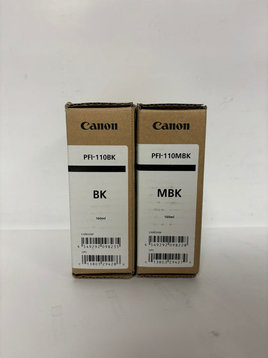 2 New OEM Canon TX2000,TX3000,TX4000 Ink Tanks PFI-110BK, PFI-110MBK (EXP: 2023)