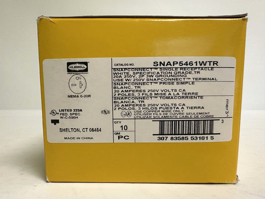 10 PK Hubbell (SNAP5461WTR) Tamper Resistant Receptacle, 20A, 250V, White