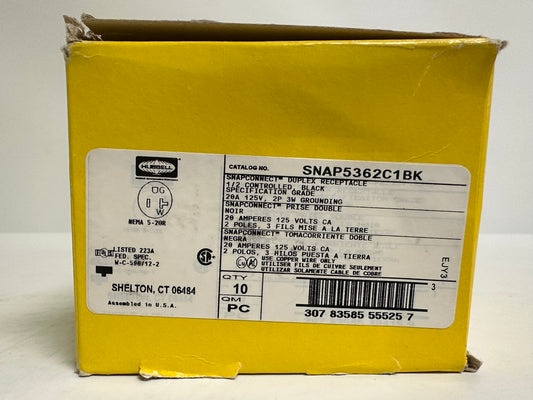 10 PK Hubbell (SNAP5362C1BK) Duplex Receptacle, 20A, 125V, 2-Pole, Black