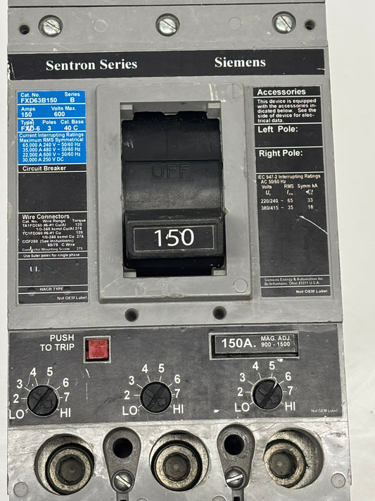 Siemens FXD63B150 Molded Case Circuit Breaker 150 AMPS 600 Volts