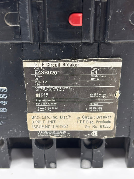 Siemens E43B020 Bolt-On 3-Pole Circuit Breaker, No Box