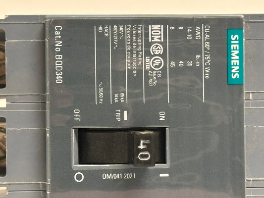 Siemens BQD340 40A 3-Pole 480V AC Thermal-Magnetic Circuit Breaker