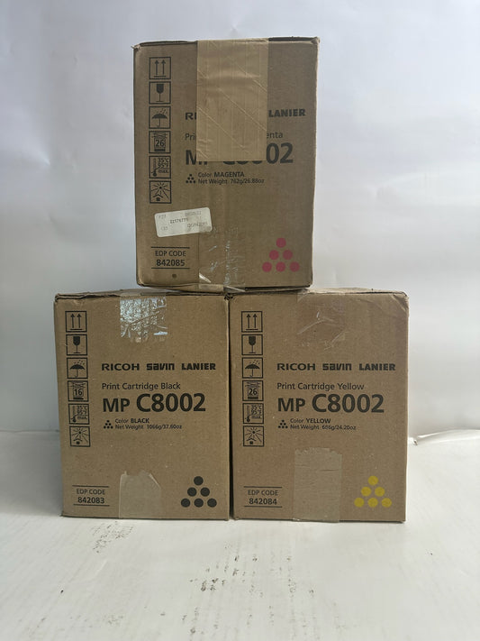 3 Genuine Ricoh MPC6502SP, MPC8002SP MYK Toners 842083,842084,842085 (No Cyan)