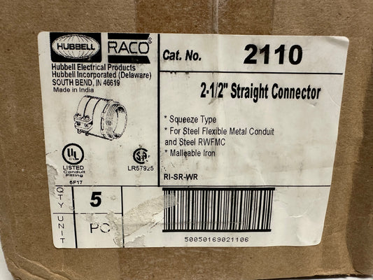 5 PK Raco (2110) 2 1/2" Straight Malleable Squeeze Flex Connector, Uninsulated