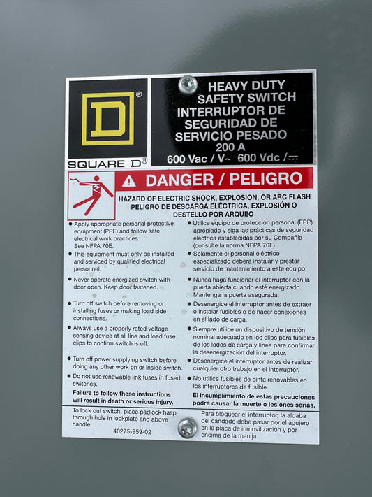Square D H364 200a 600v 3Ph Fusible Type 1 Indoor Safety Switch Disconnect