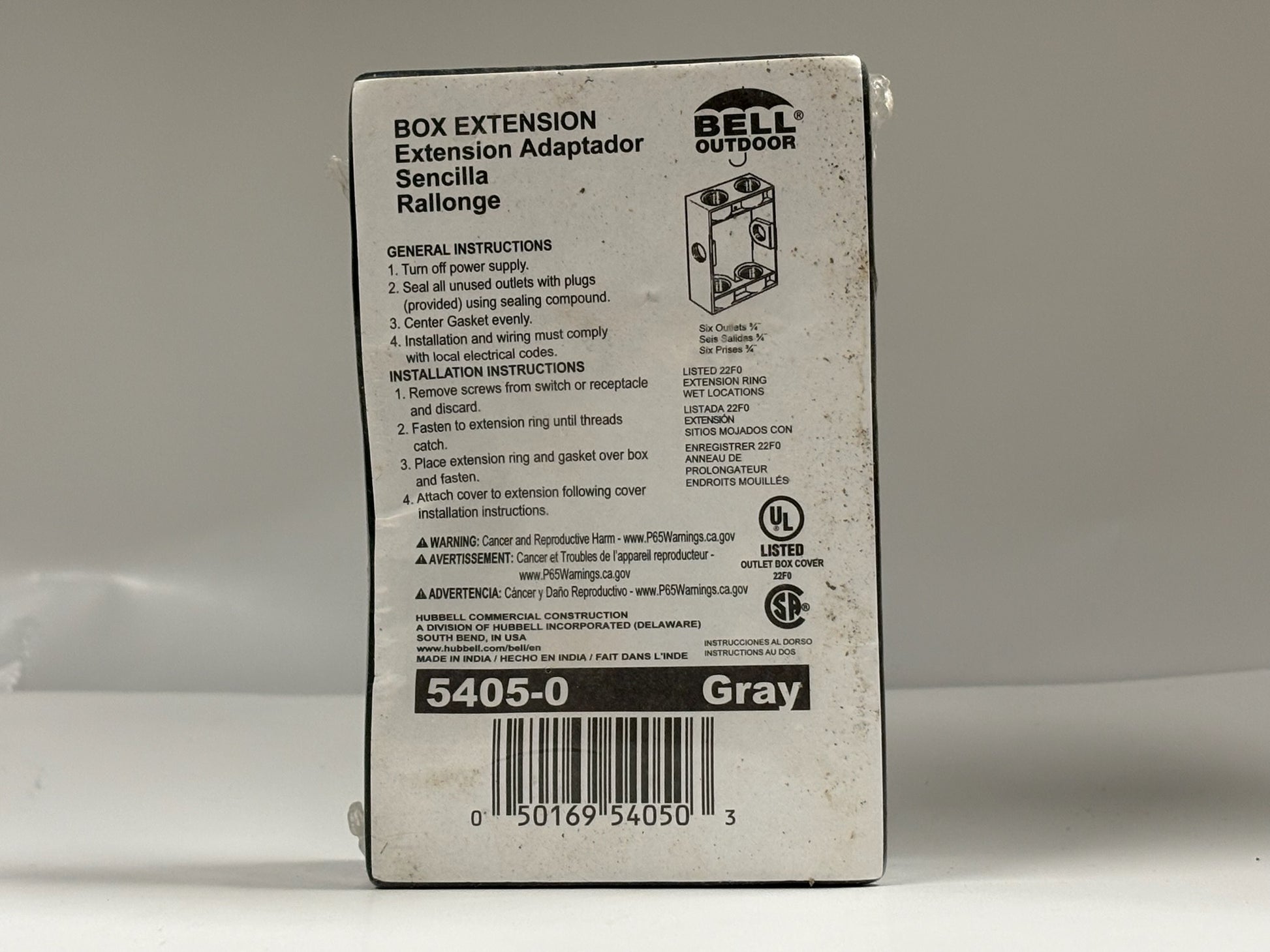 The Bell 54050 is a 1-gang weatherproof outdoor electrical box made from durable die-cast aluminum. It features six ½″ threaded hubs and a 1.5″ depth, offering flexible wiring options for switches, outlets, or fixtures. The box includes closure plugs, mounting hardware, and a pre-installed ground screw for easy installation. With a gray powder-coated finish and NEMA 3R rating, it provides reliable protection against rain and corrosion. Ideal for residential or commercial outdoor electrical setups.