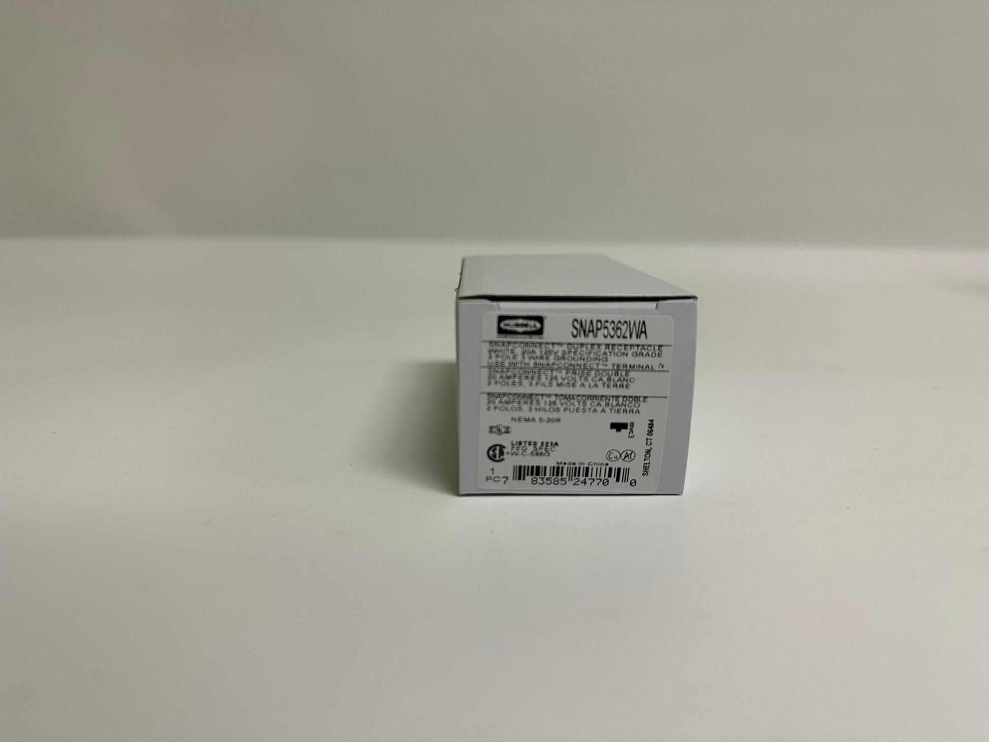 The Hubbell SNAP5362WA is a 20A, 125V duplex receptacle from the SNAPConnect® series, designed for fast and reliable installation in commercial and residential applications. It utilizes a modular, snap-in connection system that eliminates the need for traditional wire termination methods. The device provides a secure and consistent electrical connection with an audible "snap" to confirm proper installation. Made with a durable white nylon face and base, it complies with NEMA 5-20R and UL 498 standards. It supports #12 AWG solid copper wire and is suitable for use in energy-efficient building designs. This receptacle is brand new and comes in its original, unopened box.