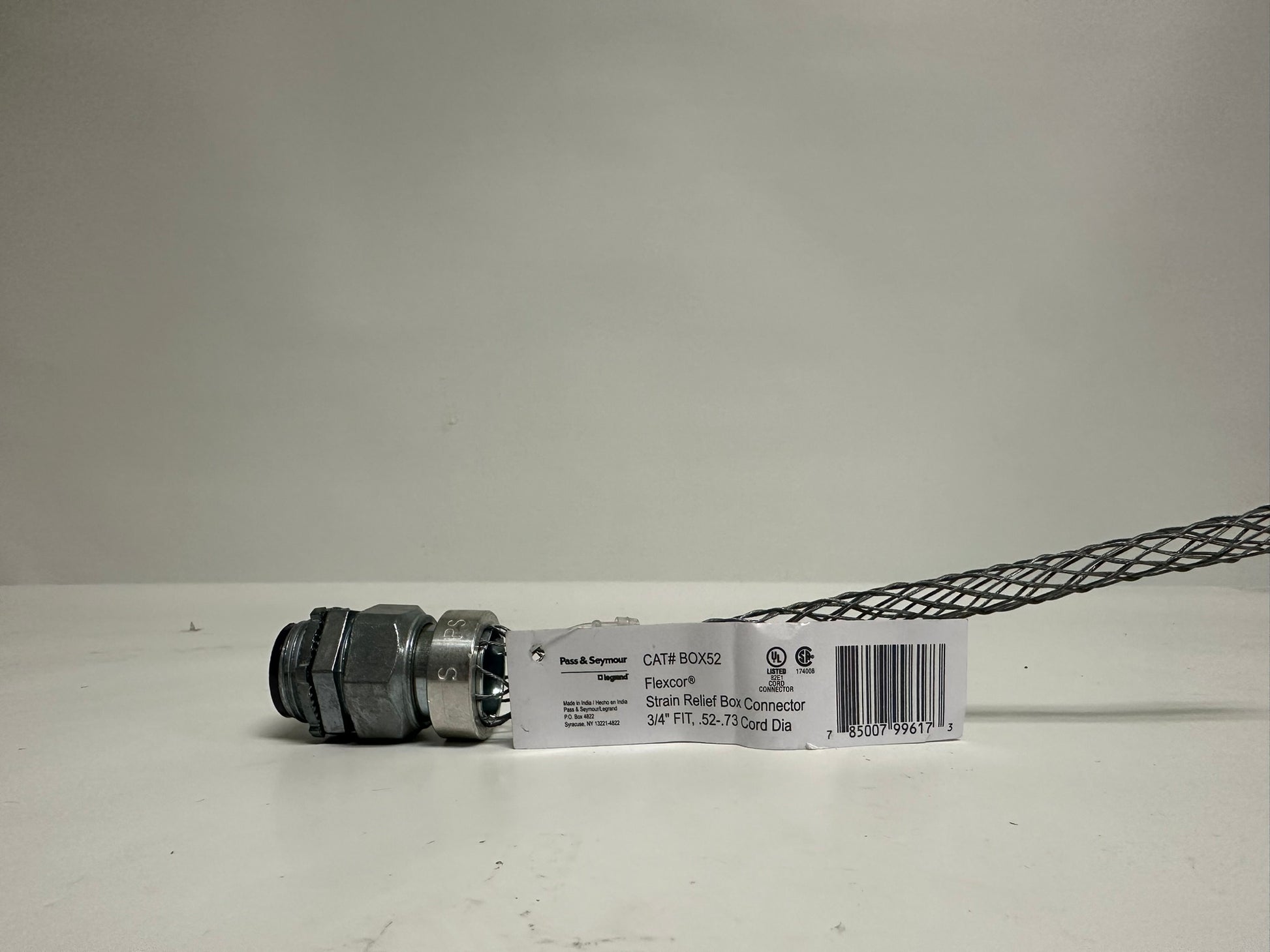 The Legrand BOX52 is a 3/4-inch NPT strain relief box connector designed for secure cable entry into enclosures and power boxes. It features a durable single-weave Flexcor® mesh grip that supports cable diameters from 0.52 to 0.73 inches. An insulated bushing protects cables from abrasion, ensuring a tight and safe connection. With a 450 lb breaking strength, the BOX52 is ideal for demanding industrial applications. It is UL Listed and CSA Certified for reliable performance and safety.