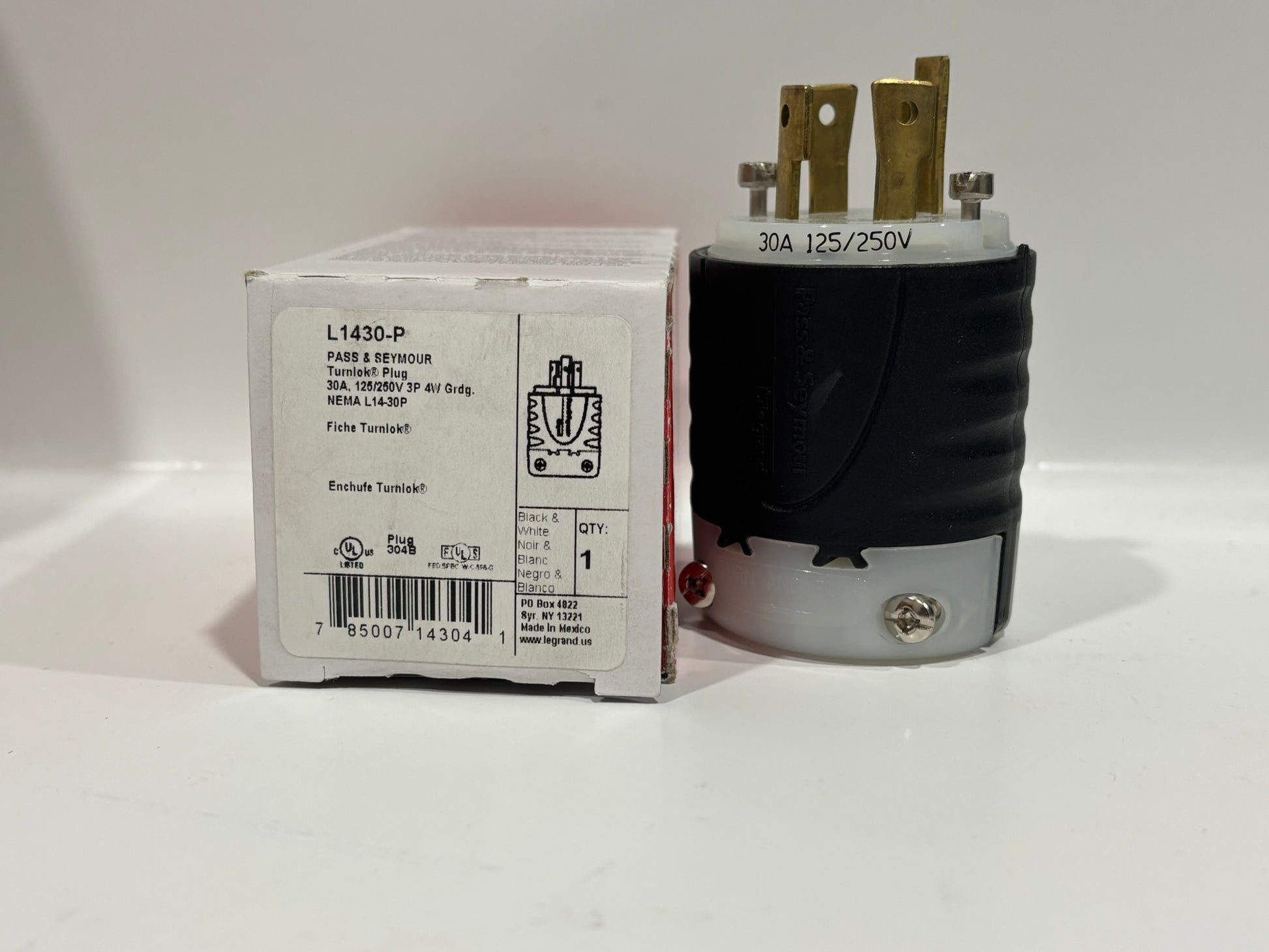 The Legrand L1430-P is a 30-amp locking plug designed for 125/250V industrial power applications. It features a durable nylon shell and brass alloy blades for long-lasting performance. The plug supports a 3-pole, 4-wire grounding system and fits cords from 0.385 to 1.15 inches in diameter. Its rugged design resists impact, heat, and corrosion, making it ideal for demanding environments. Certified by UL and CSA, it ensures safe and reliable power connections.