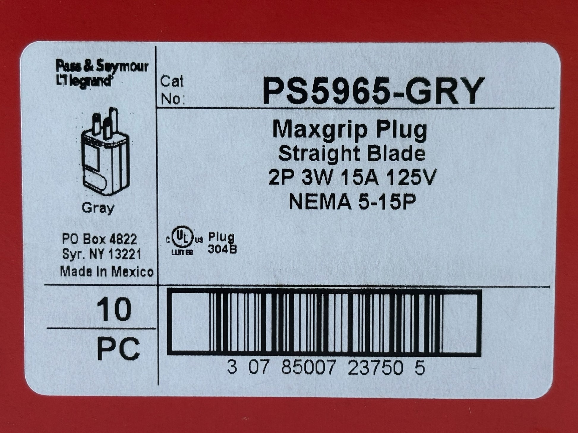 This 10-pack of Legrand PS5965-GRY plugs offers durable, reliable 15 Amp, 125 Volt straight blade connectors with a gray nylon housing. Designed for easy handling with molded grips and a self-hinge for secure cord connections. Perfect for residential and light commercial use. UL and cULus certified for safety and performance.