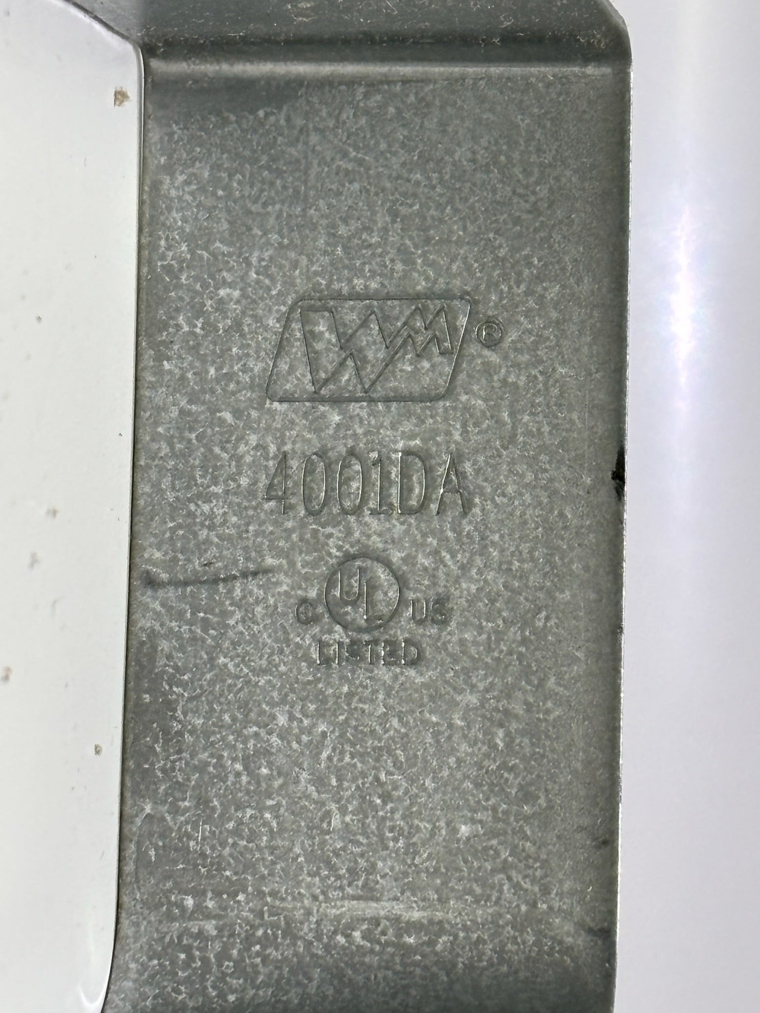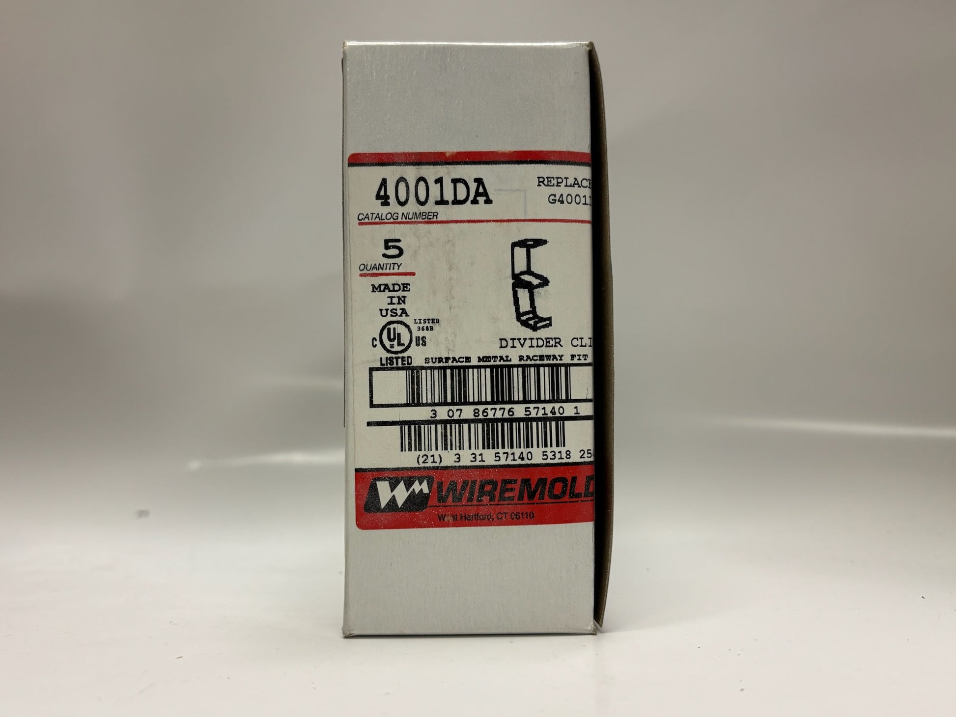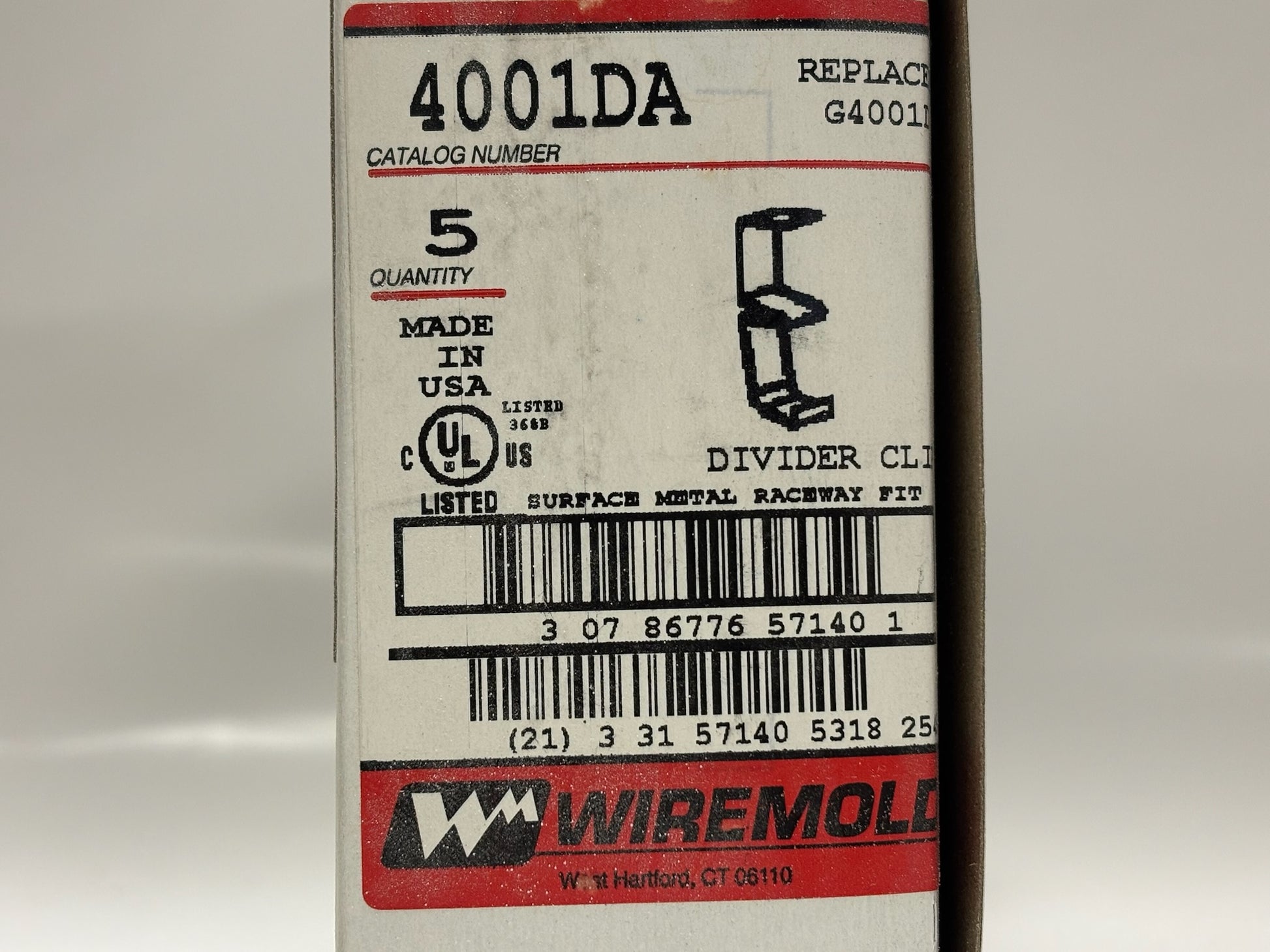 The Wiremold 4001DA is a galvanized steel divider clip designed to secure the G4000D divider within the 4000 Series surface raceway. It ensures proper separation of power and data cables, maintaining organized and code-compliant installations. The clip is durable, easy to install, and required every 2½ feet along the divider. Ideal for commercial and industrial wiring applications, it helps keep wiring neat and safe.