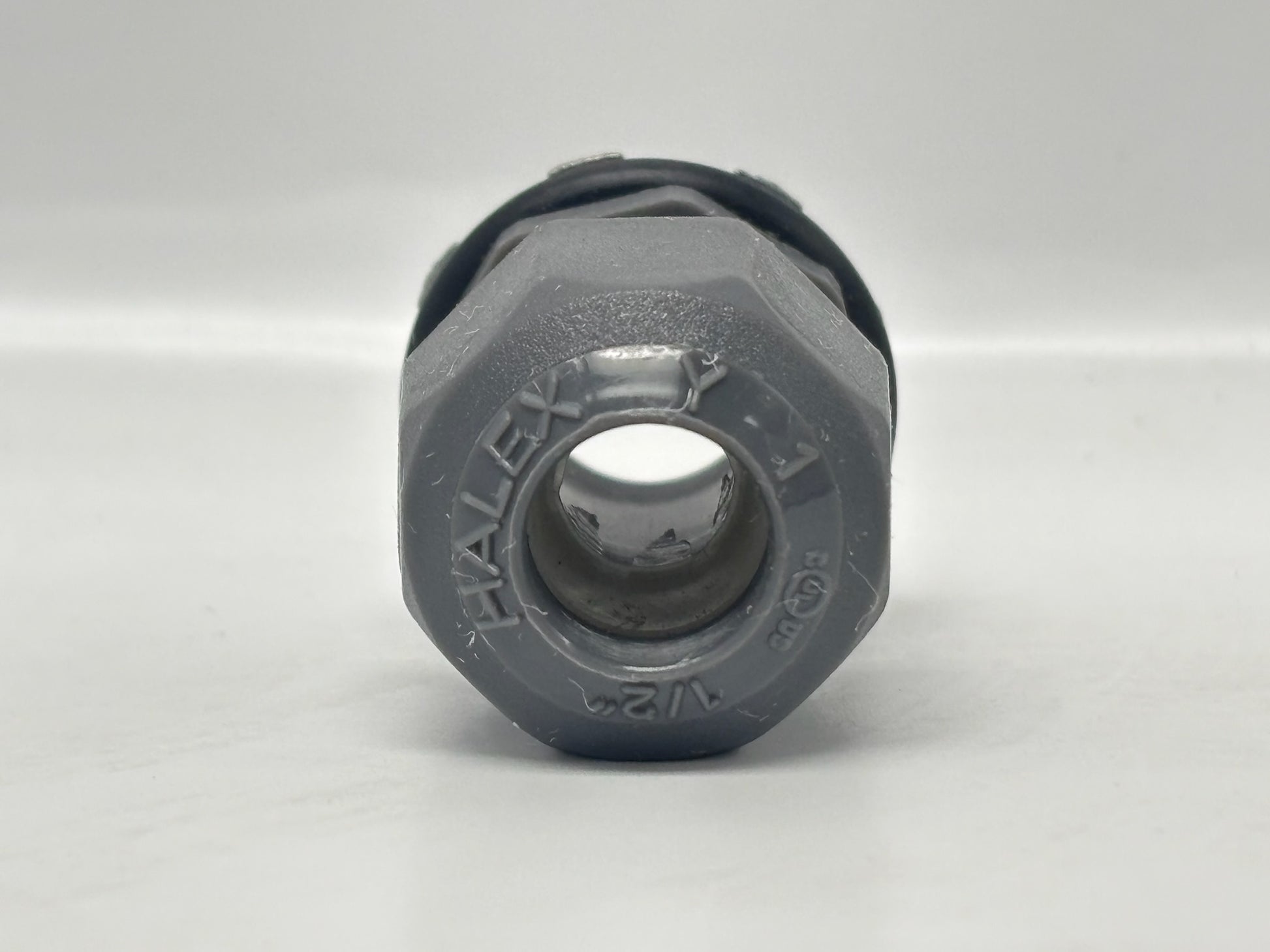 This non‑metallic strain relief connector from Halex is sized for ½″ trade openings and is intended for indoor use. It provides a gland‑style, liquid‑ and oil‑tight seal with a sealing ring and zinc locknut to secure flexible cords. It fits cord diameters from 0.235″ to 0.400″, accommodating types like S, SO, ST, SJ, SJO, and SJT. Ideal for connecting portable cords into metal enclosures or junction boxes.