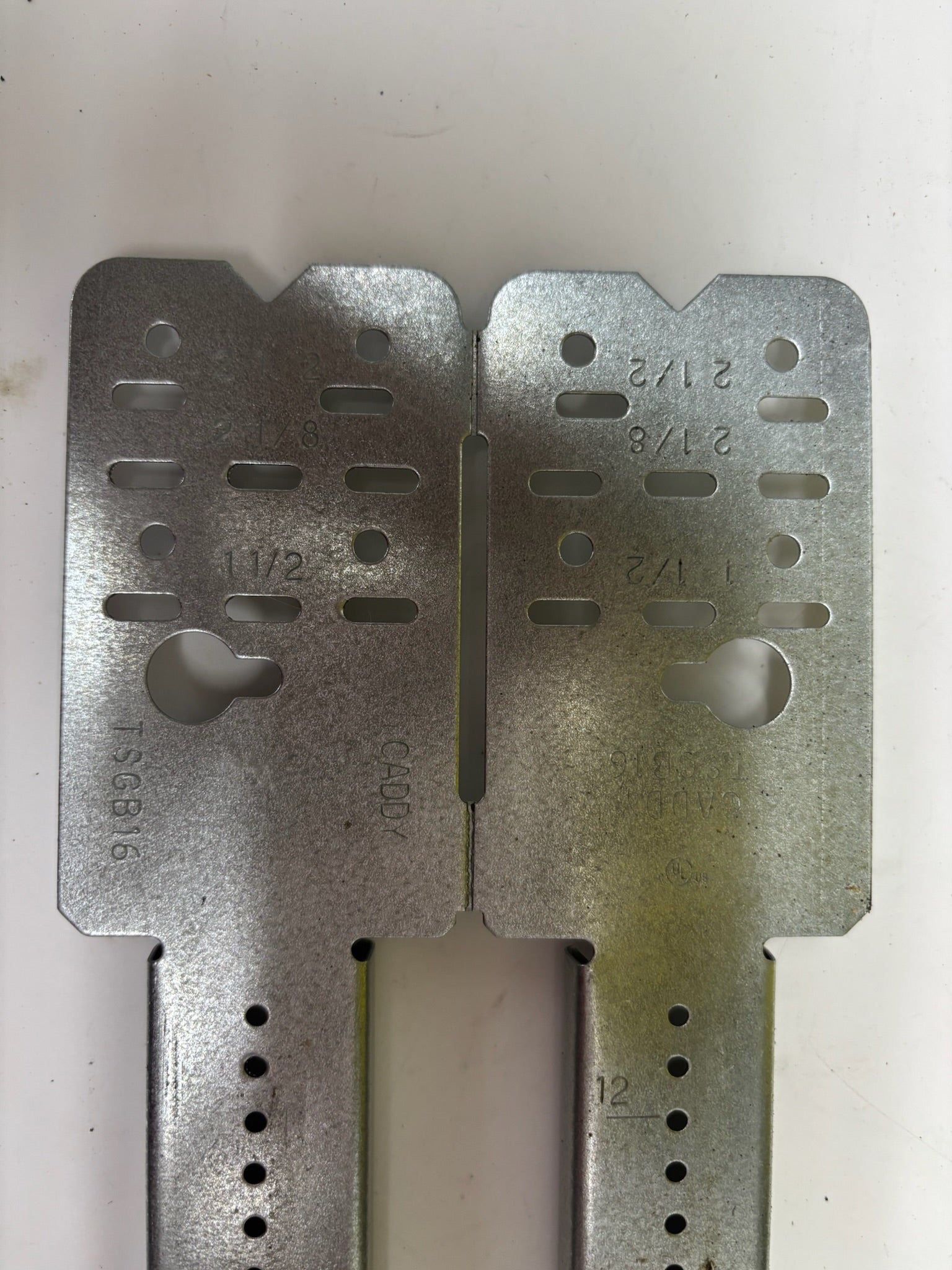 The Nvent Caddy TSGB16 is a telescoping screw gun box bracket designed for efficient electrical box installation between studs. Its adjustable length accommodates varying stud spacing, enhancing versatility on the job site. The bracket features pre-drilled holes and guides for precise, consistent mounting. Built for speed and convenience, it simplifies the rough-in process for electrical contractors.