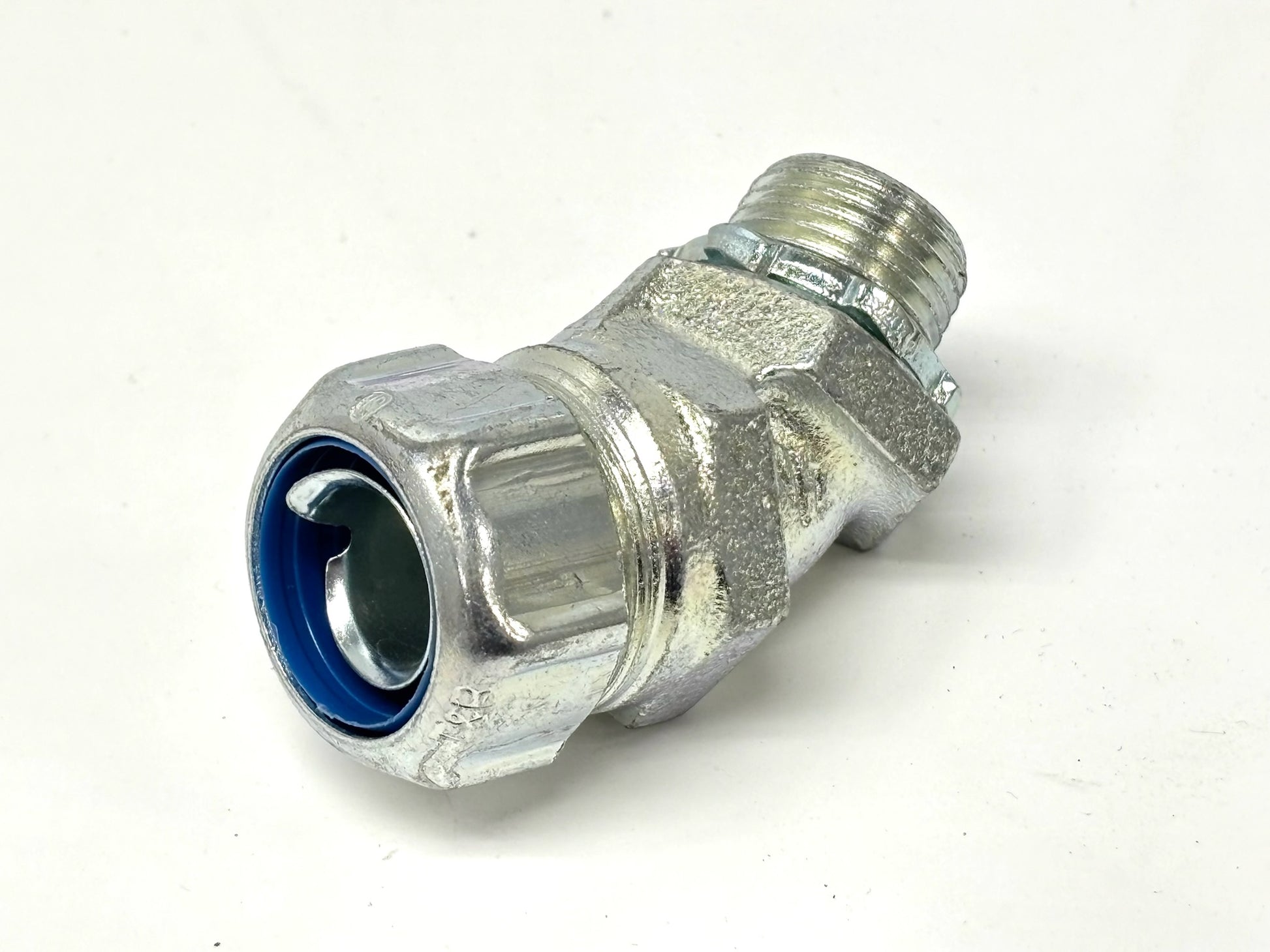 A 45° non‑insulated angle connector made of chromate‐coated electro‑zinc malleable iron, designed for ½″ liquid‑tight flexible metal conduit; ideal for wet, indoor/outdoor, or industrial settings where secure bonding to enclosures is required.