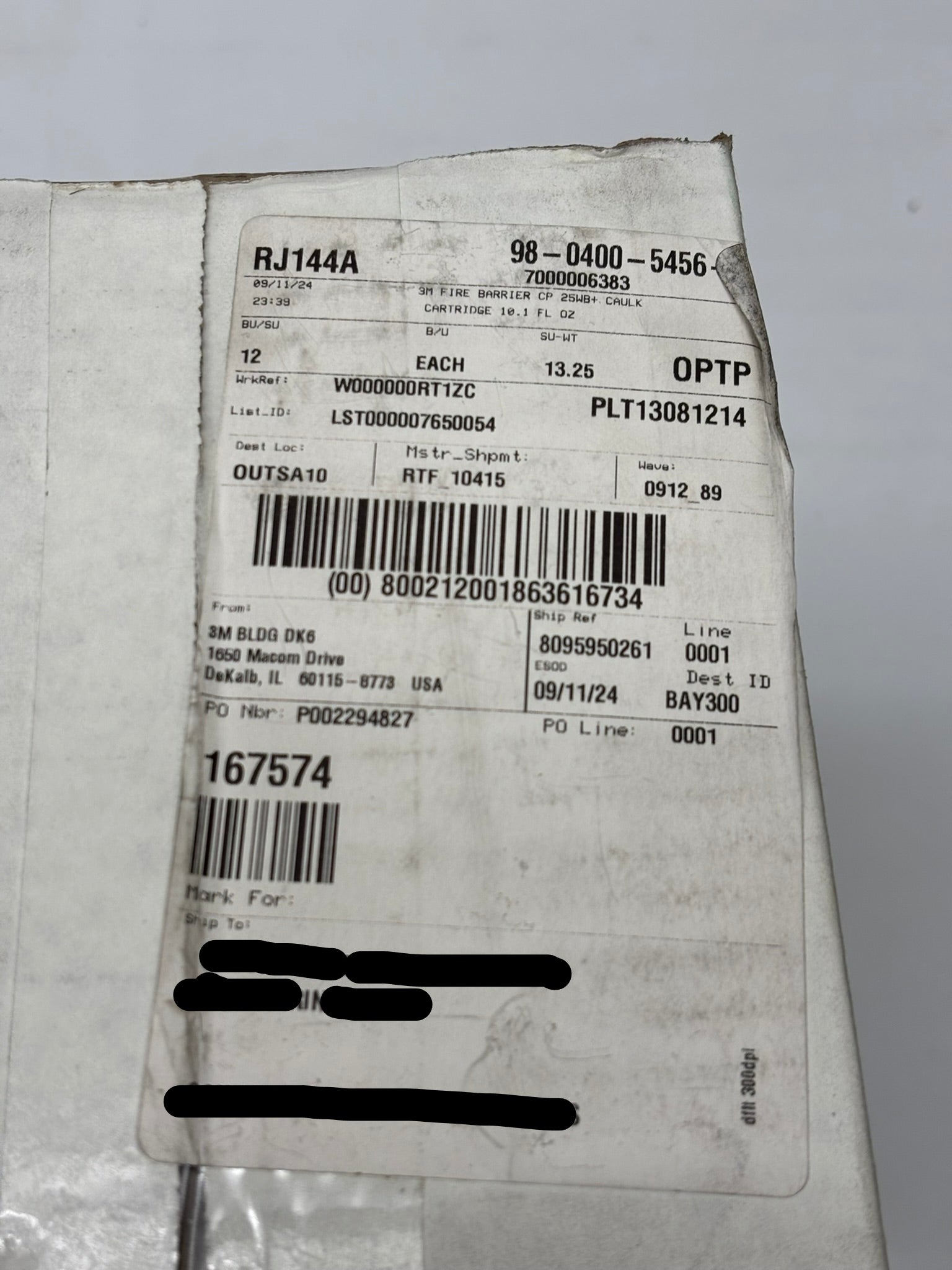 The 12 PK 3M CP25WBT Fire Barrier Sealant is designed for use in firestopping applications, providing excellent protection against fire, smoke, and toxic gases. This high-performance sealant is ideal for sealing joints and gaps around pipes, cables, and other penetrations in fire-rated walls and floors. With its easy-to-apply, water-based formula, it offers a durable, long-lasting barrier that meets stringent fire protection standards. Perfect for commercial, industrial, and residential projects, the 3M CP25WBT is UL and FM approved for reliable firestopping performance.