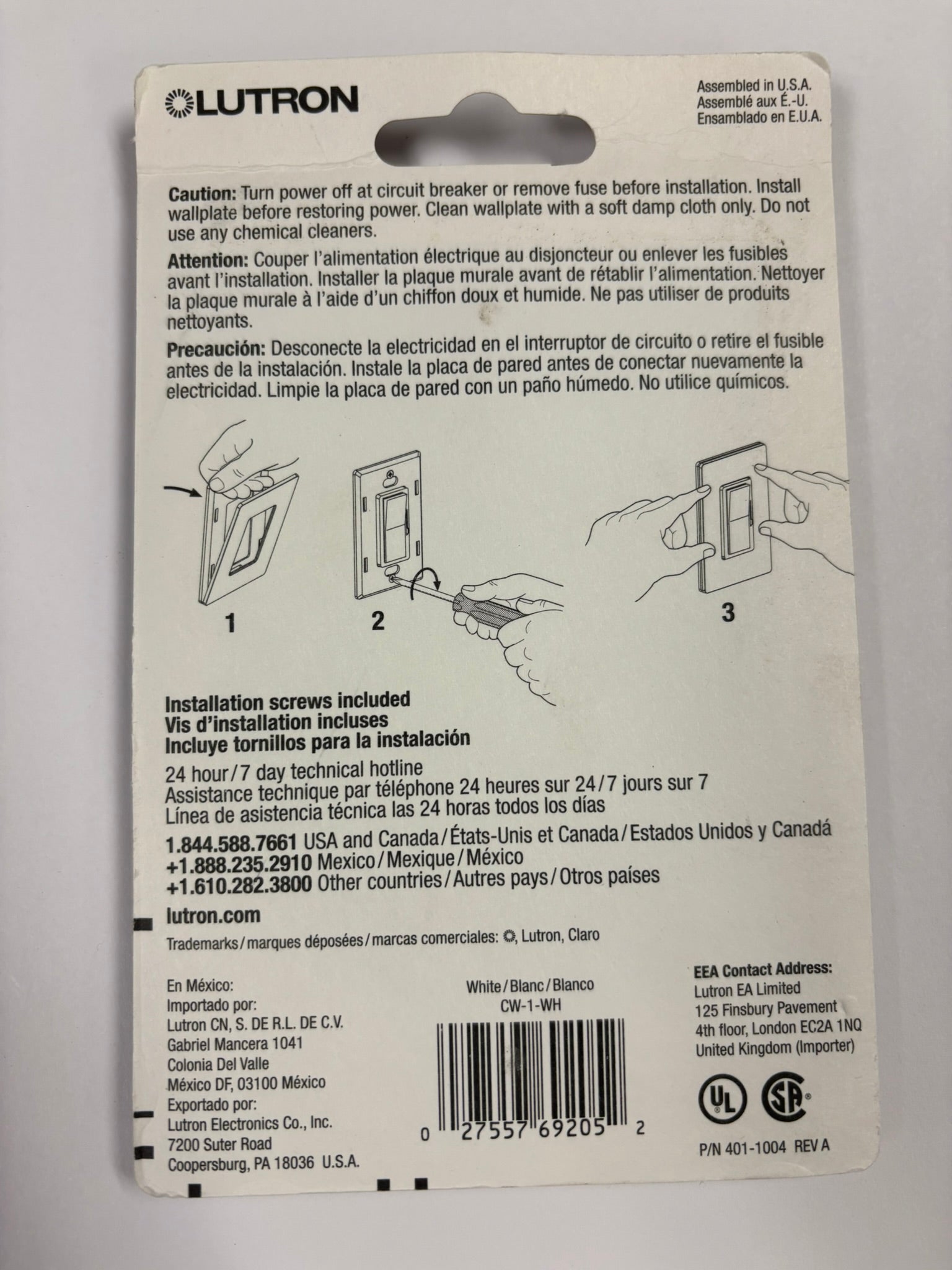 The Lutron CW-1-WH is a 1-gang screwless wall plate from the Claro collection, designed for a clean, modern look. Made from durable thermoset plastic with a gloss white finish, it complements decorator-style switches and dimmers. Its snap-on design hides screws for a seamless appearance. Compatible with Lutron Caseta, Diva, Maestro, and Skylark devices, it's ideal for residential or commercial use.