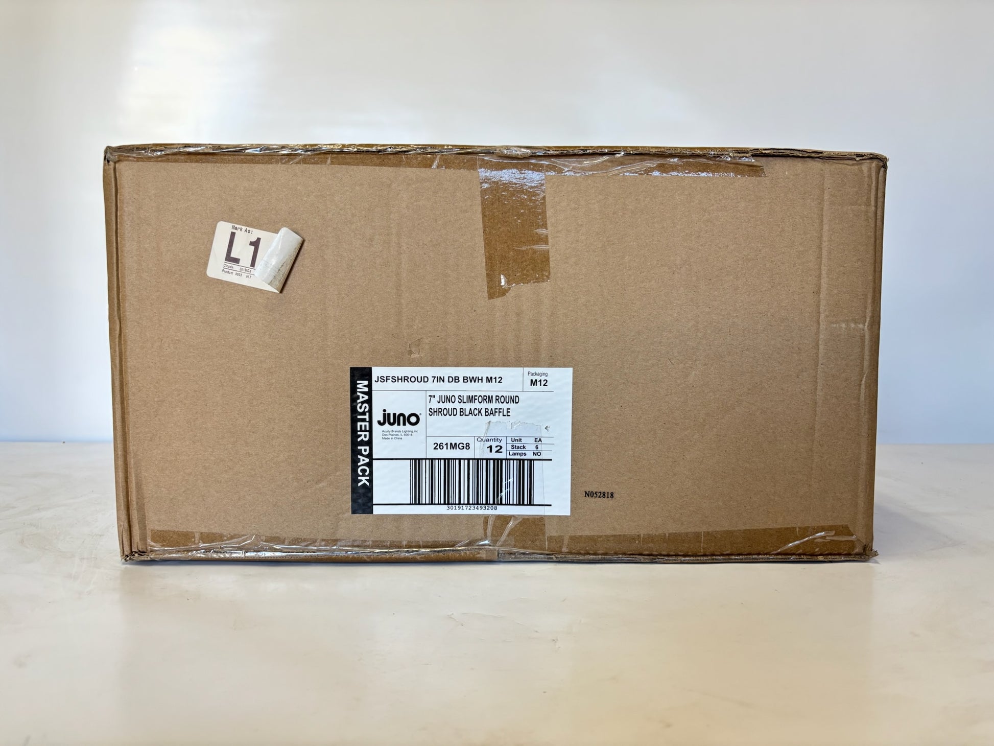 The Juno JSFSHROUD 7IN DB BWH M12 is a 7-inch SlimForm round shroud accessory designed for use with Juno SlimForm LED fixtures. It features a durable die-cast construction with a deep black outer finish and a white baffle interior to enhance light diffusion and reduce glare. This decorative trim provides a clean, finished look for ceiling installations while helping to direct light output. It easily attaches to compatible fixtures and is ideal for both residential and commercial applications.