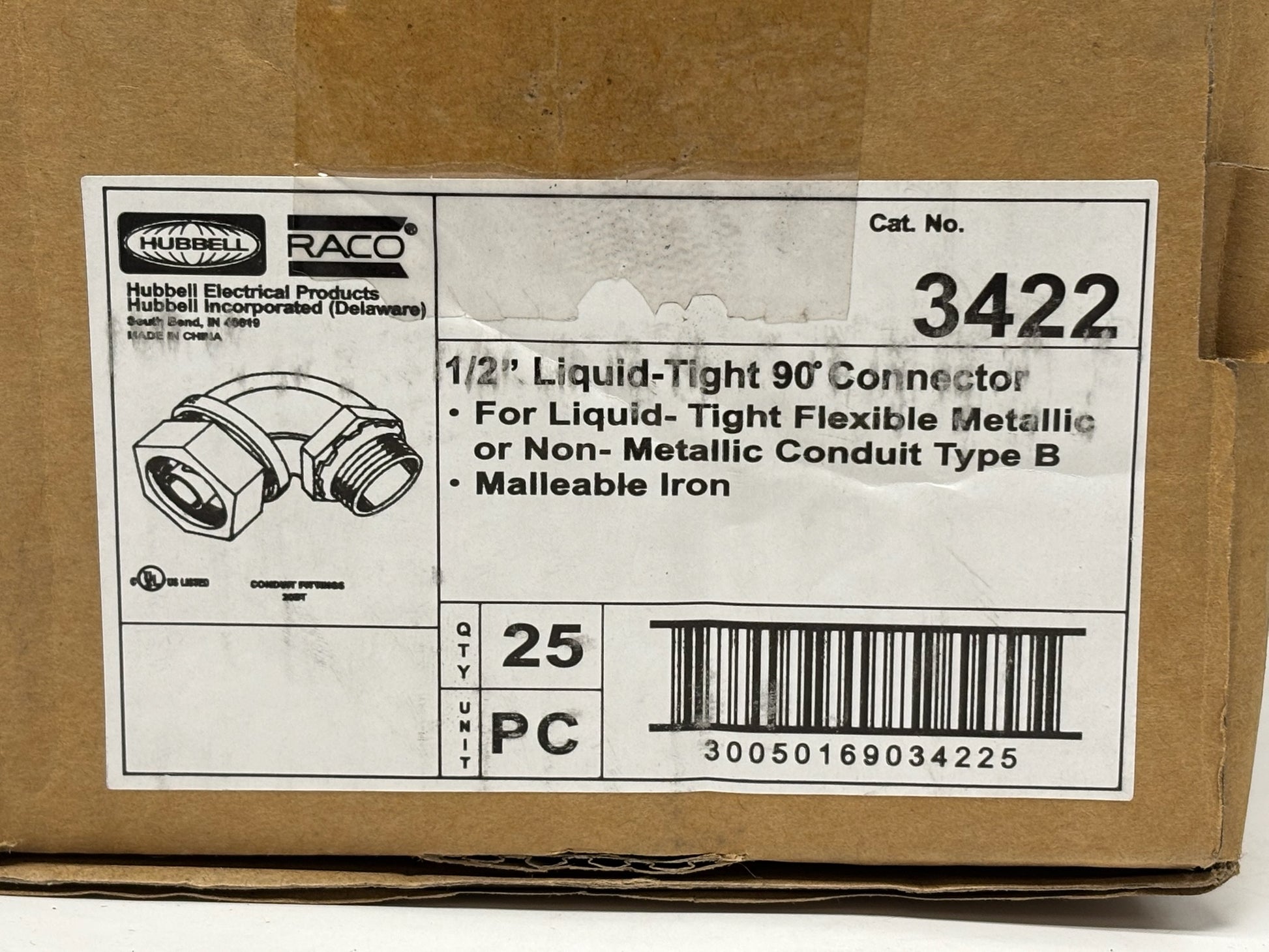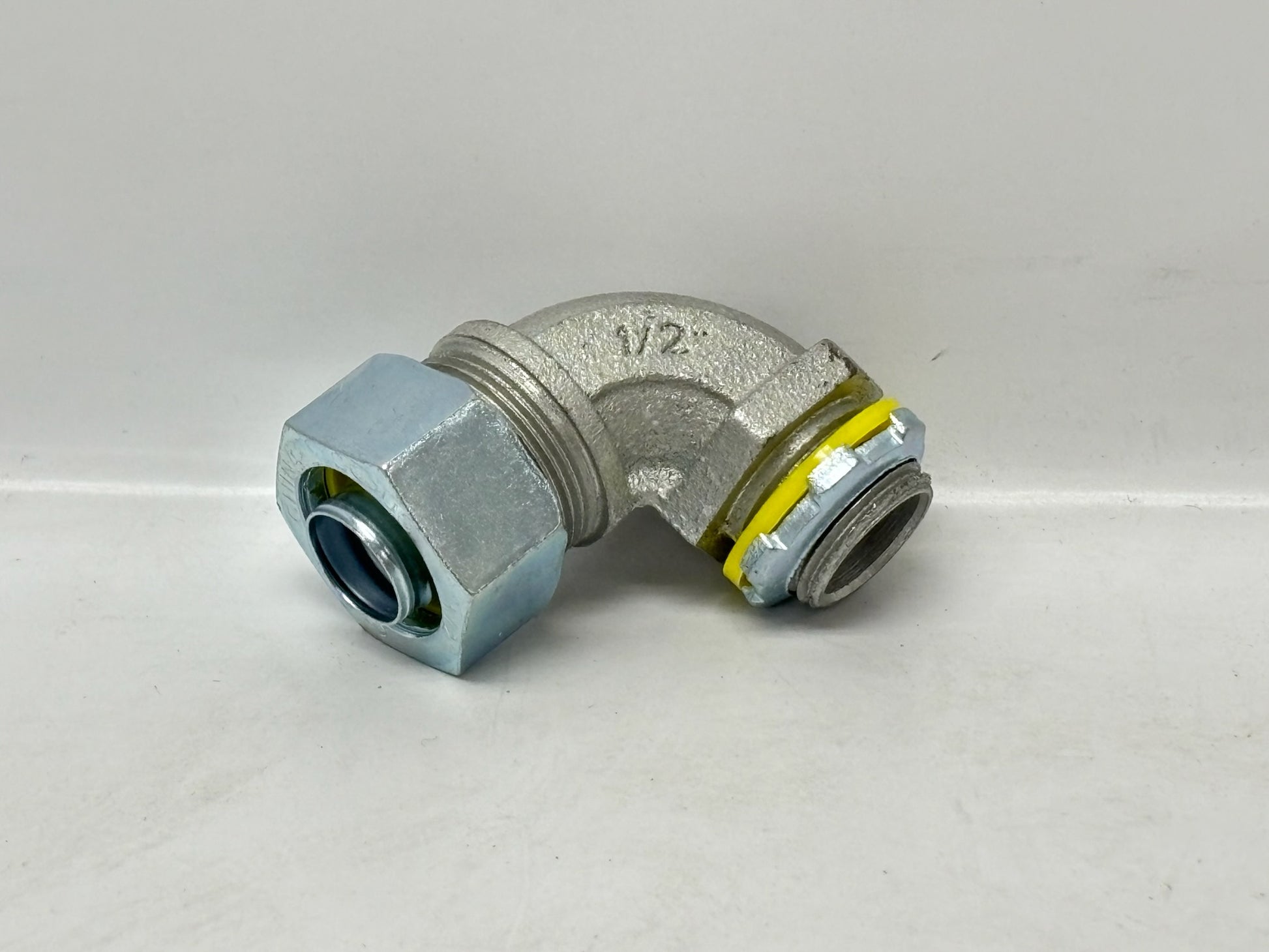 The RACO 3422 is a ½" trade size, 90° liquidtight conduit connector designed for flexible metallic and Type B non‑metallic liquidtight conduits. It features a zinc‑electroplated body with a patented split gland ring to ensure a secure, leak‑resistant seal. The connector is non‑insulated and includes a sealing washer and heavy‑duty locknut for reliable grounding. It is UL‑listed, CSA certified, and suitable for Class I, II, and III hazardous location use.