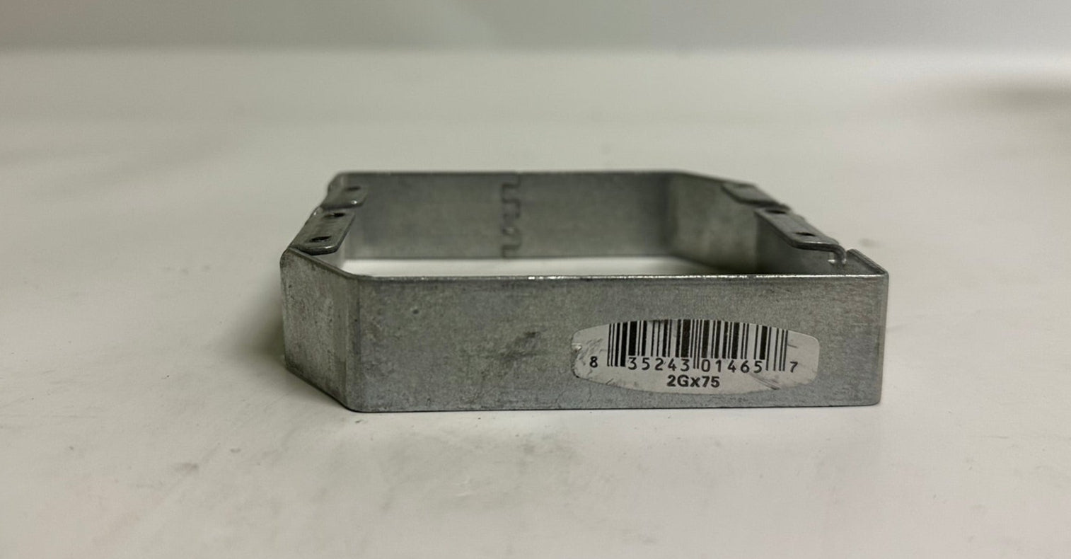 The Orbit 2GX75 is a new, 2-gang adjustable ring extension designed to add 3/4 inch of depth to electrical outlet boxes, ensuring a flush finish with the wall surface. Constructed from 16-gauge galvanized sheet steel, it offers durability and resistance to corrosion. This extension mounts easily to compatible adjustable rings, such as the Orbit 4SAR2G and 5SAR2G, using two 8-32 screws. Multiple extensions can be stacked on a single ring to achieve greater depth if needed. It is UL and ETL approved, RoHS compliant, and suitable for both residential and commercial applications. Sold in packs of 50, the Orbit 2GX75 provides a cost-effective solution for ensuring proper alignment of 2-gang electrical boxes with wall surfaces.