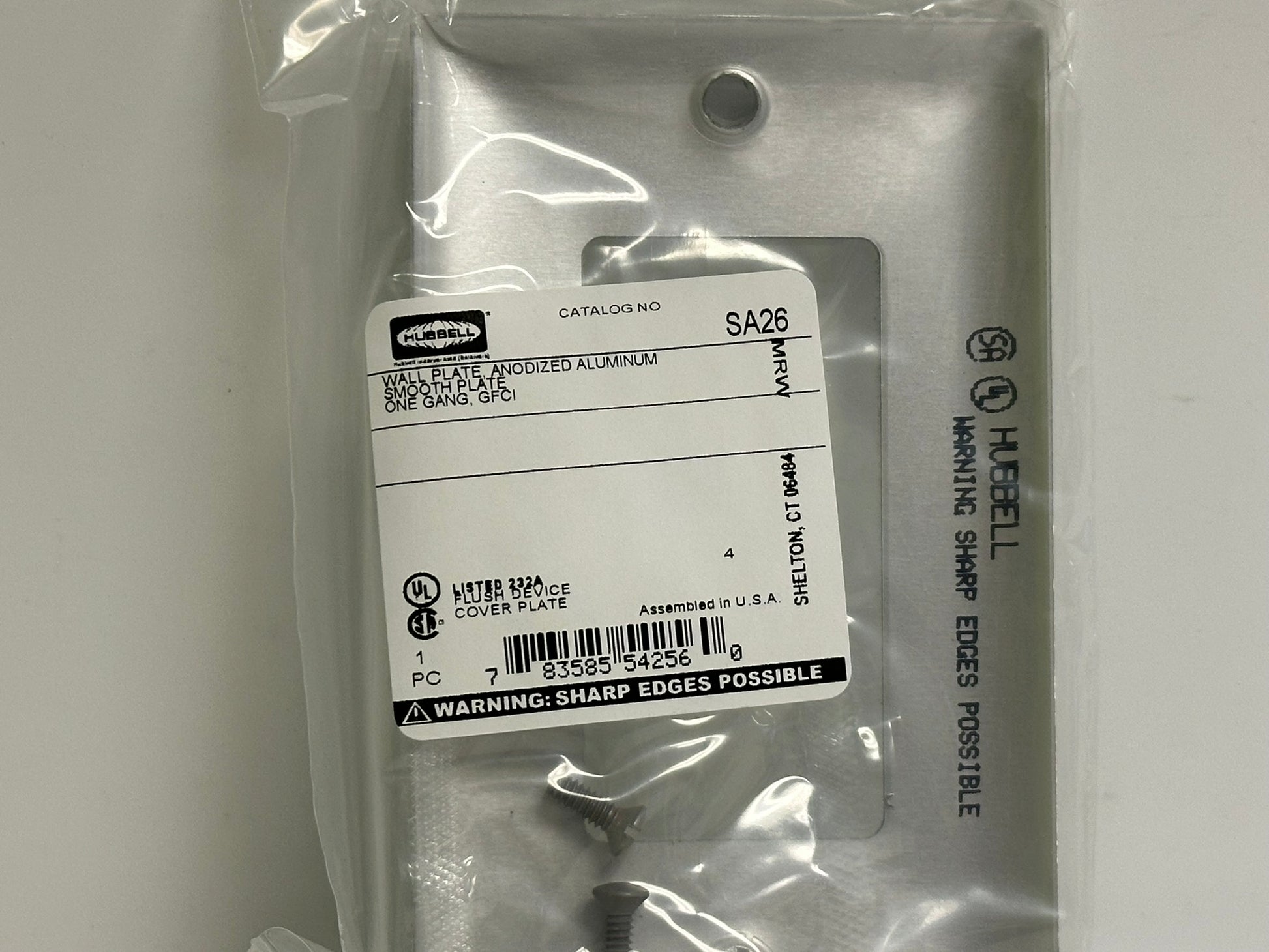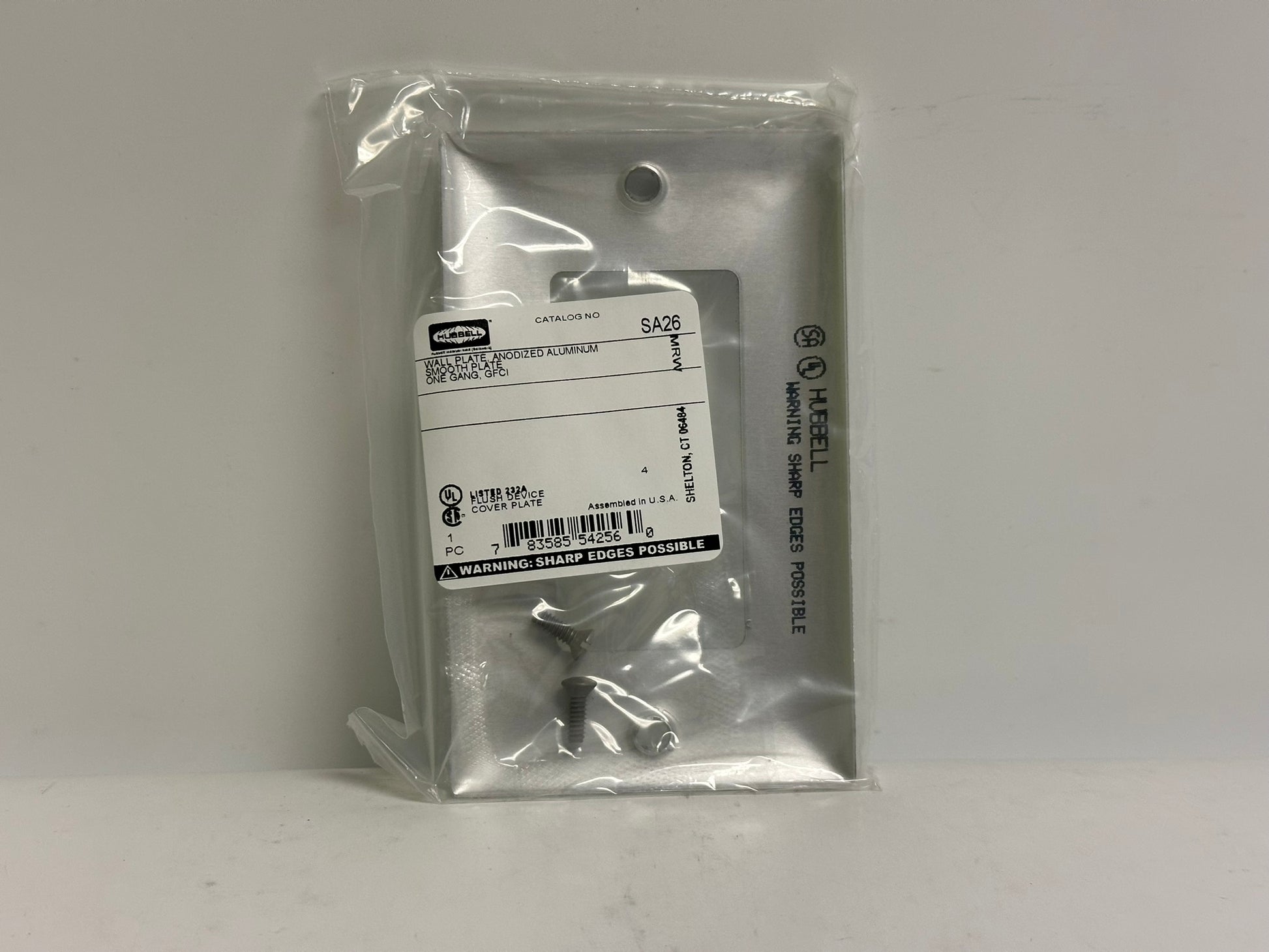 The Hubbell SA26 Wallplate is a 1-Gang GFCI (Ground Fault Circuit Interrupter) outlet box cover made from durable aluminum. Designed for both residential and commercial applications, this wallplate provides a sleek, professional finish while ensuring safety and functionality. It fits standard 1-gang GFCI outlets, offering protection from electrical faults. The aluminum construction is both sturdy and aesthetically appealing, ideal for environments where durability and style are essential. The SA26 is easy to install, providing a secure and attractive solution for electrical outlets.