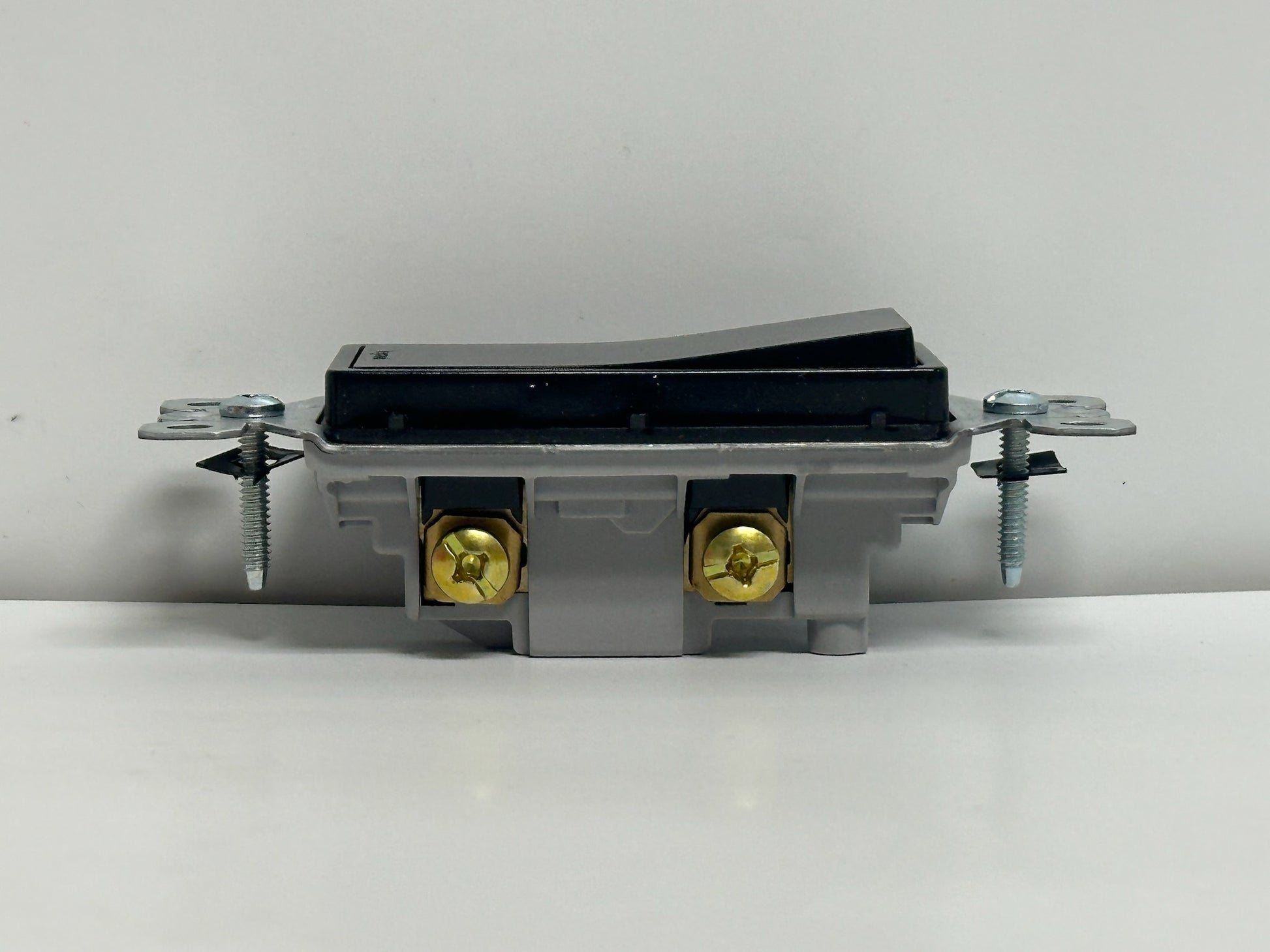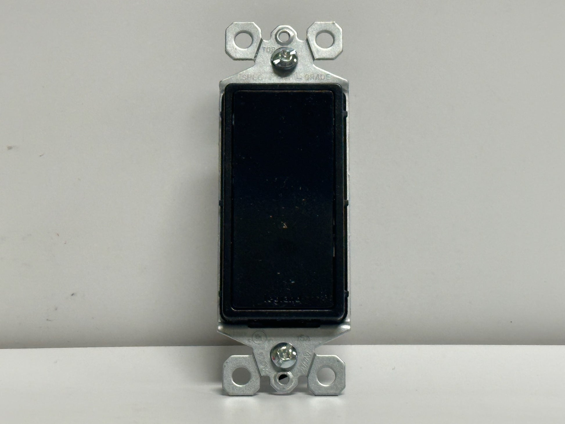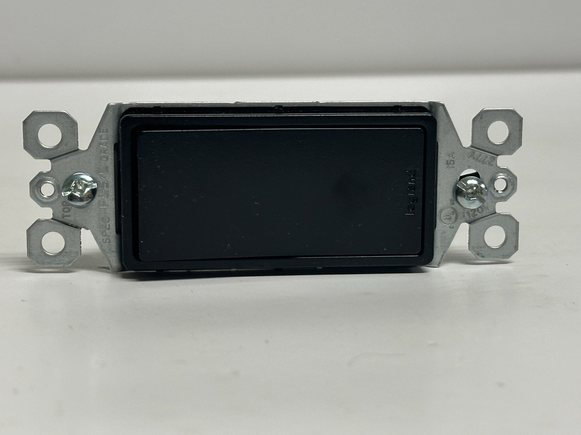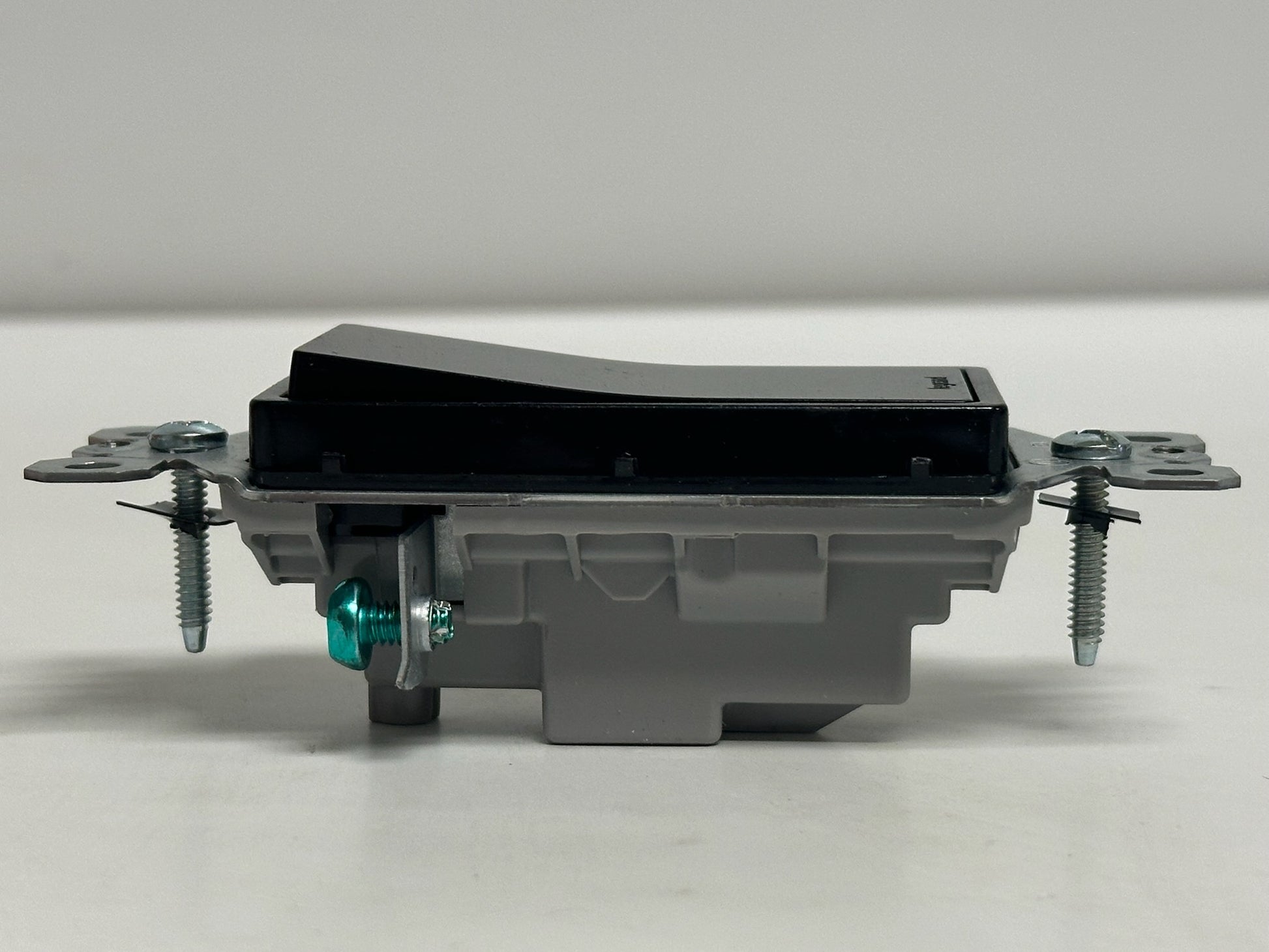 The Legrand TM870BK is a 15-amp, 120/277V single-pole paddle light switch from the radiant® collection, designed for both residential and commercial applications. This switch features a sleek black matte finish and is constructed from high-impact resistant thermoplastic for durability. It offers smooth paddle action for easy operation and is designed for quick installation with a narrower back body and captivated mounting screws. The TM870BK is UL 498 and CSA C22.2 No. 111 certified, ensuring safety and reliability. It accepts wire sizes from #14 to #10 AWG and is compatible with screwless radiant® wall plates, sold separately.