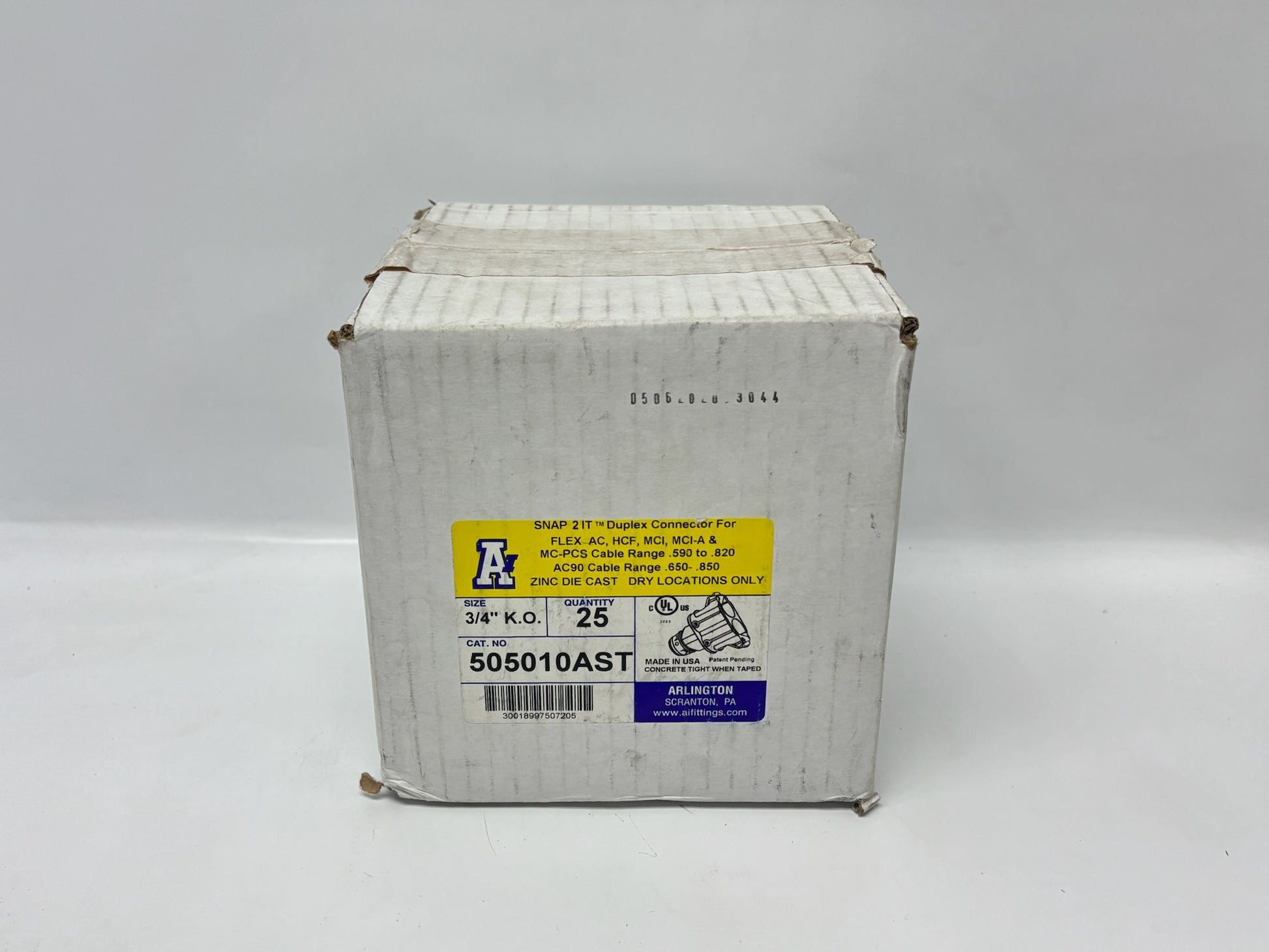 This Arlington 505010AST Snap²IT® duplex cable connector features a die-cast zinc body, ½″ trade size with a ¾″ knockout and supports twin cable openings sized 0.65″-0.85″. It installs without tools — simply snap onto the conduit with the spring-steel clip, then snap into the knockout. Built for AC/MC/HCF steel or aluminum cable, and rated concrete-tight when taped.