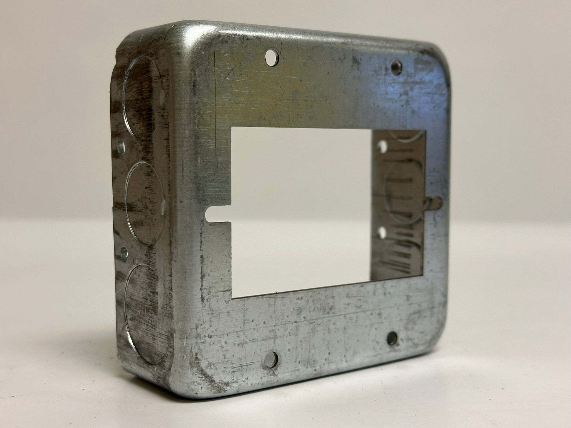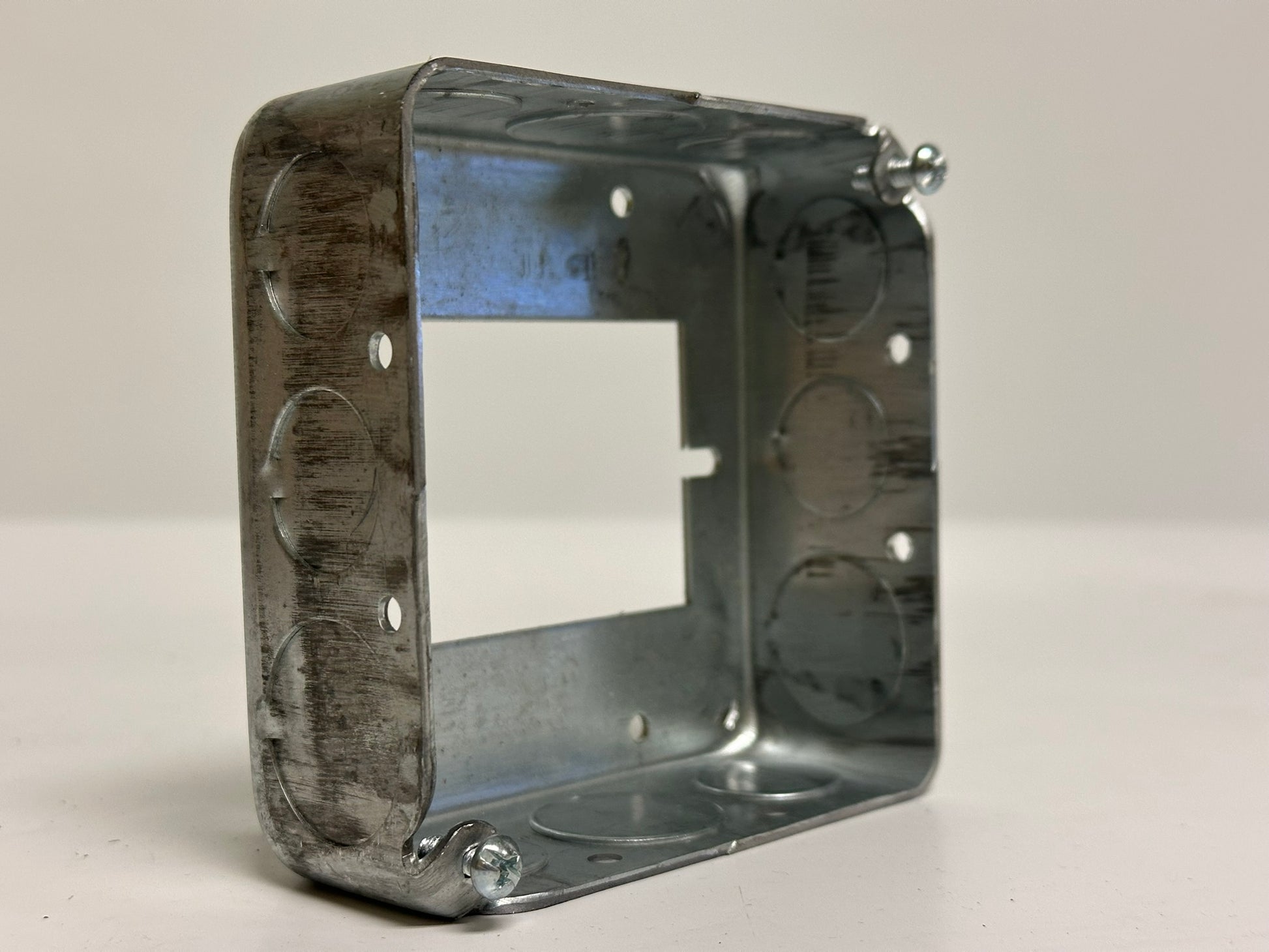 The Raco 187 4" Square Extension Ring is a durable, pre-galvanized steel box extension designed for 2-gang switch boxes in conduit wiring systems. With a 1-1/2" depth and a 22.5 cubic inch capacity, it provides ample space for wiring connections. Featuring 12 knockouts—(8) 1/2" conduit sides and (4) 3/4" conduit sides—it allows for flexible conduit entry and installation. UL and CSA approved, this gray-finished extension ring is a reliable choice for residential, commercial, and industrial applications.