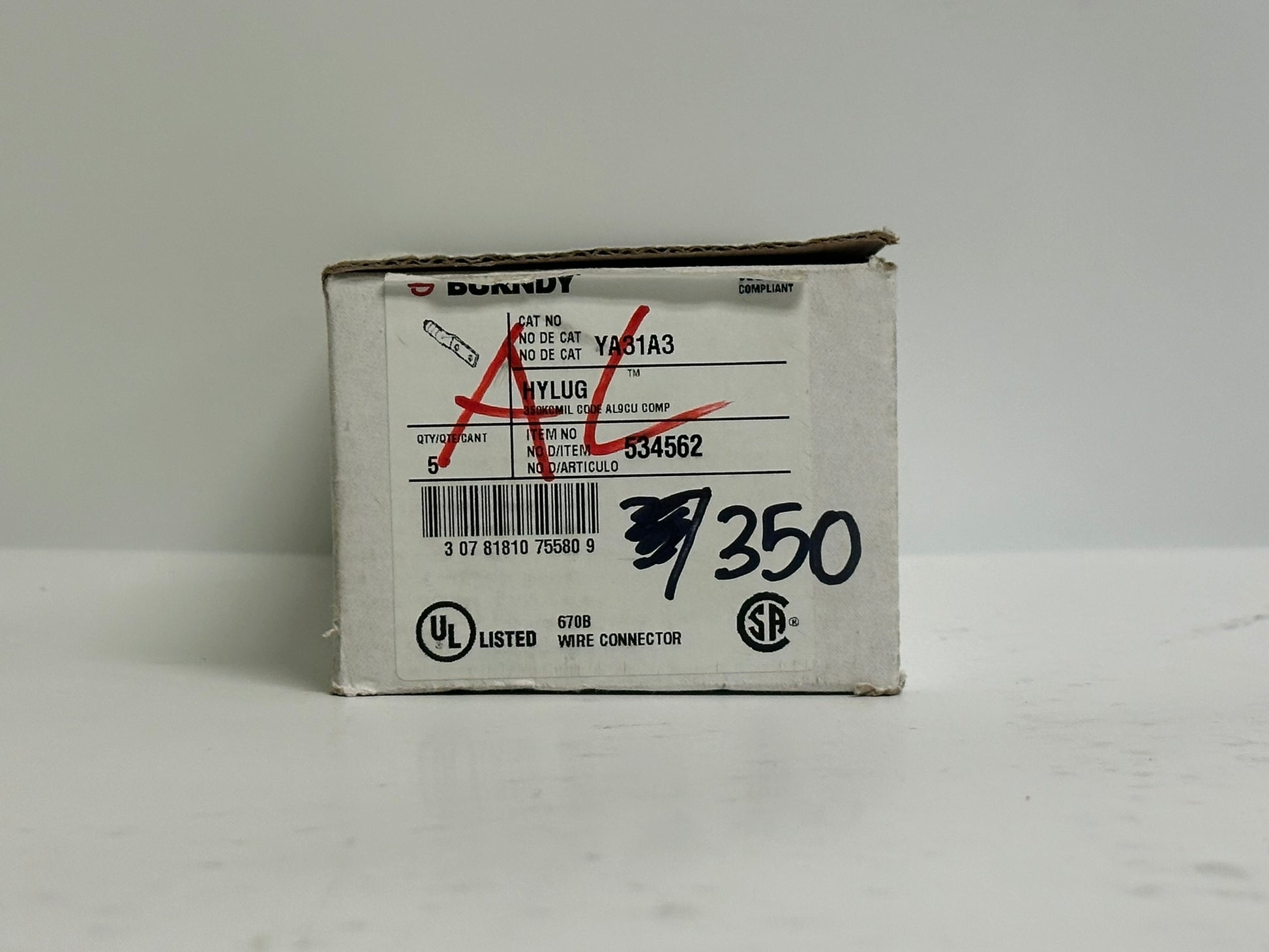 The 5 PK Burndy (YA31A3) 350 MCM Aluminum/Copper 2-Hole Lug features a 1.85-inch barrel and is designed for use with both aluminum and copper conductors. This high-quality compression lug ensures secure and reliable connections, providing excellent conductivity and low-resistance performance. Ideal for industrial and commercial applications, it is built to withstand demanding environments. The 5-pack offers convenience for larger electrical projects, ensuring long-lasting, durable connections for 350 MCM wire sizes.