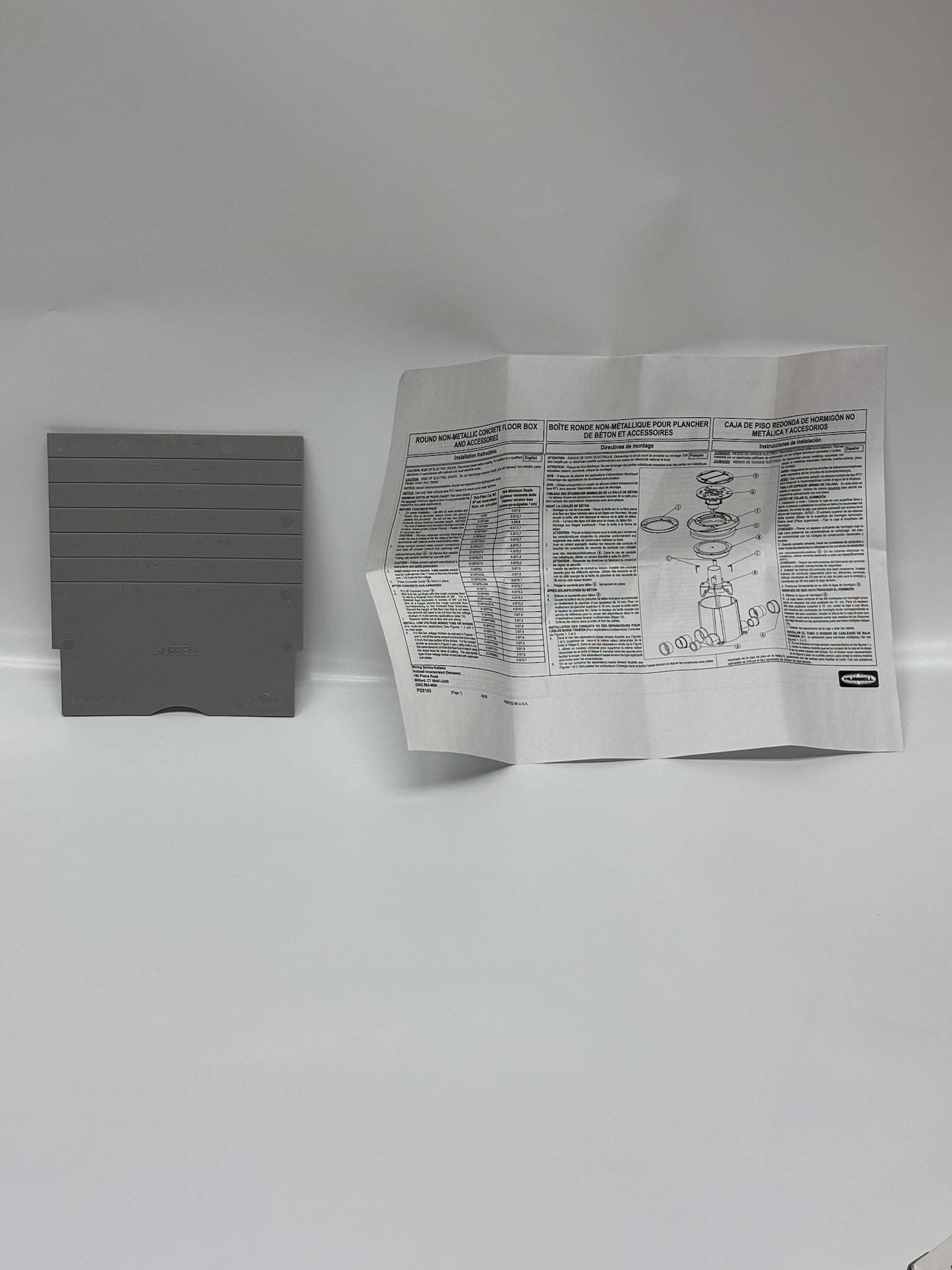 The Hubbell S1DIV1 is a gray composite side-by-side divider designed for use with Hubbell SystemOne floor boxes, including models such as S1PFB, S1SFB, and S1CFB. This durable replacement divider mounts directly onto the sub-plate to create separate compartments, allowing for organized power, data, voice, and A/V wiring within a single floor box. Constructed from high-quality, UL 514 and cULus-certified materials, it ensures safe, reliable performance in both flush and fire-rated poke-through applications. Measuring approximately 5.6″ W × 5.7″ L × 2.3″ H, the S1DIV1 offers a compact and efficient solution for maintaining clean, code-compliant floor box installations.