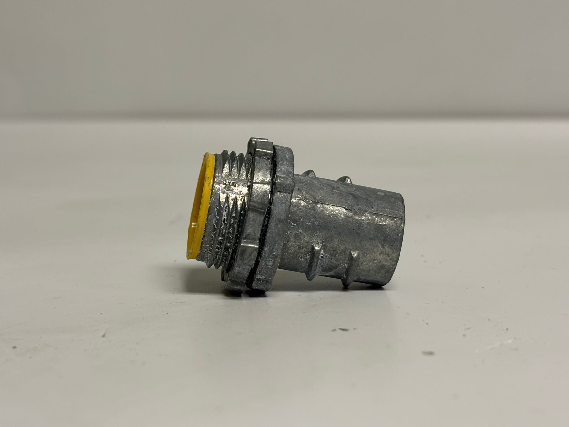 The Arlington GF75A is a 3/4" insulated screw-in connector for aluminum and steel AC, MC, and FMC conduit. Made from durable zinc die-cast, it features an insulated throat to protect conductors. This connector is UL and CSA listed and is concretetight when taped. It's ideal for secure, code-compliant electrical installations. Easy to install, it ensures long-lasting performance in demanding environments.