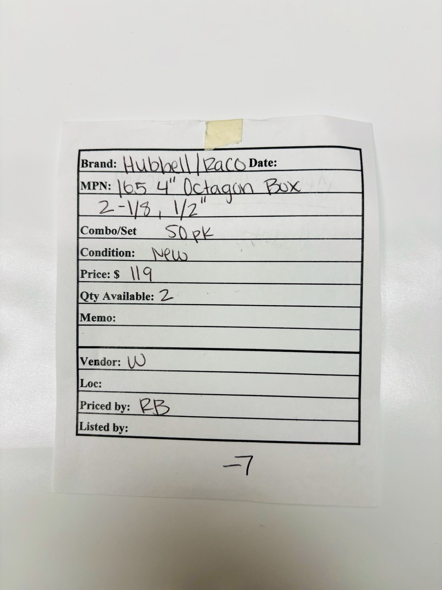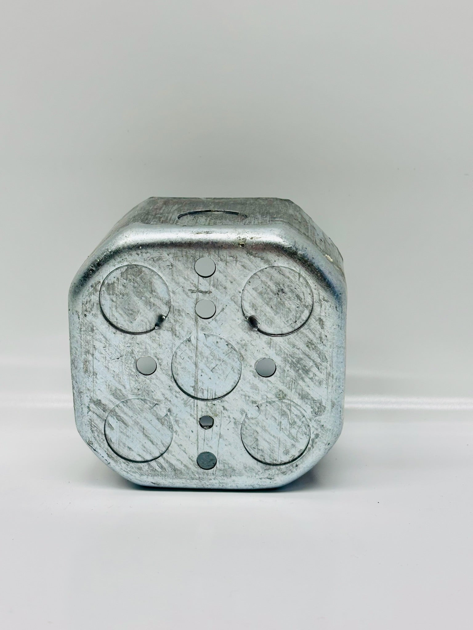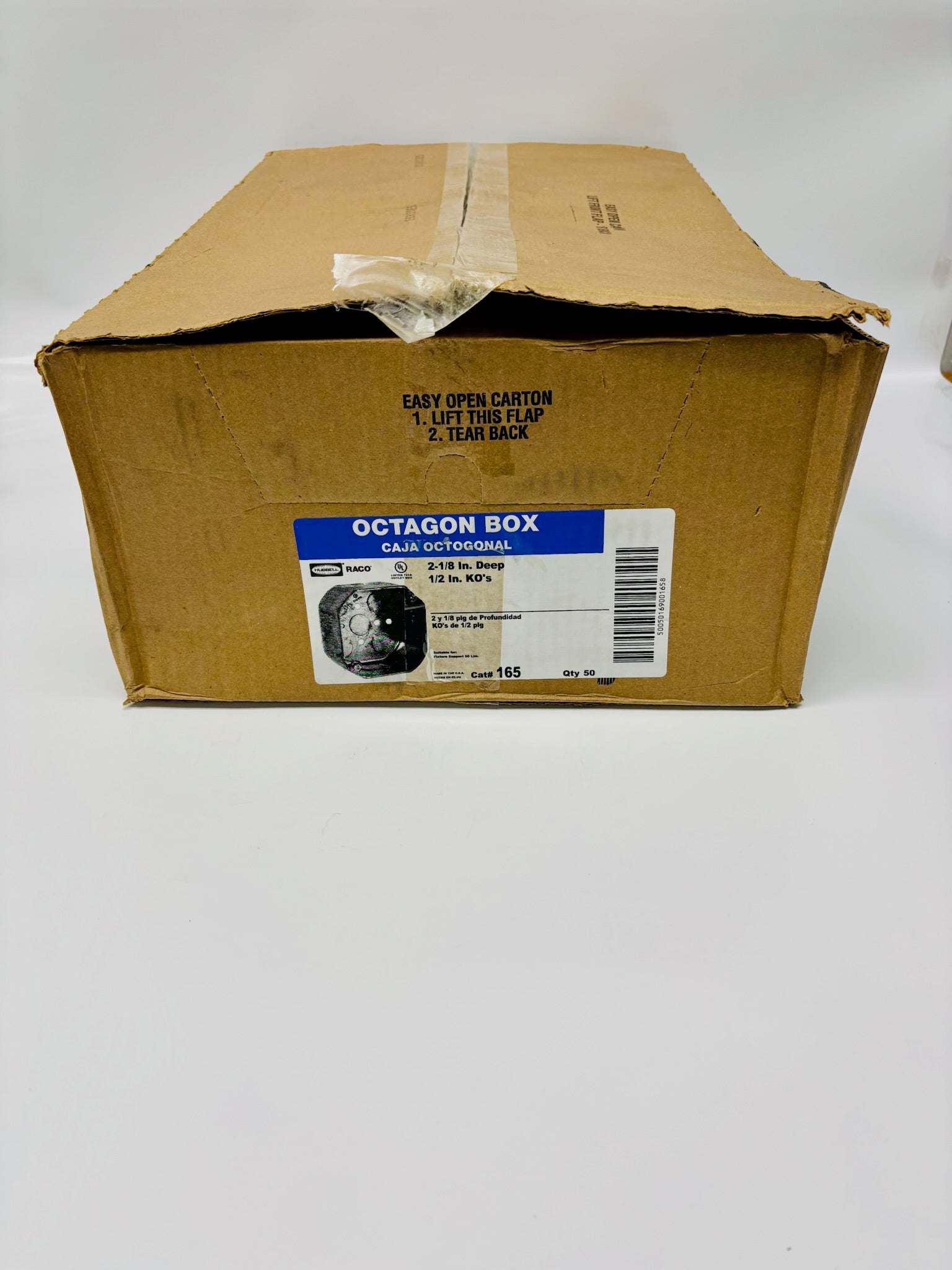 Hubbell 165 4" Octagon Box is a drawn steel electrical box used for ceiling or wall lighting fixtures or as a junction box. It has multiple 1/2 inch knockouts for conduit or cable entry and provides space to make electrical connections. The box meets UL standards and is sized to support fixtures and covers in residential and commercial installations.