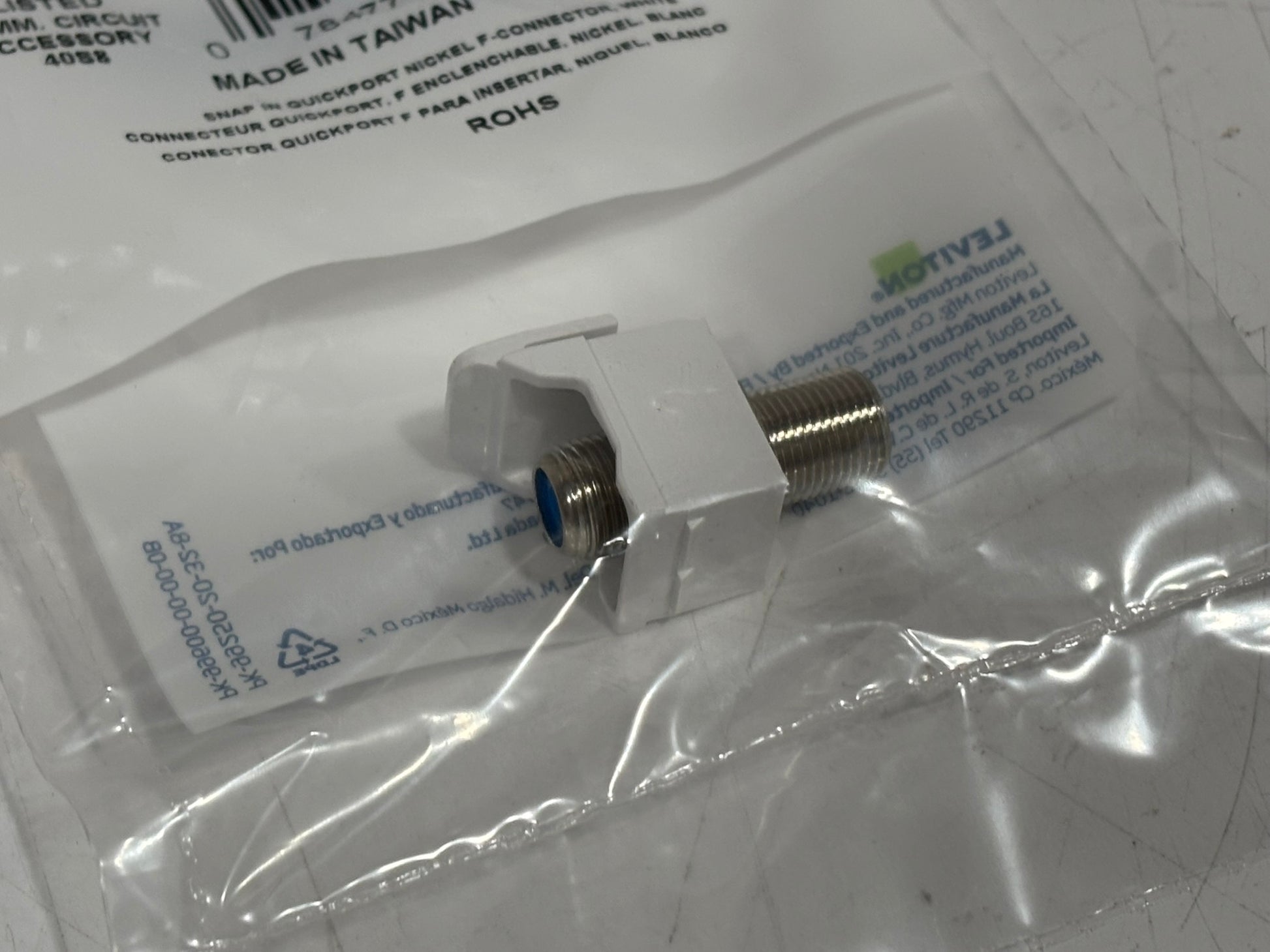 The Leviton 252-41084-FWF is a white QuickPort F-connector adapter designed for use with RG-6 and RG-59 coaxial cables. It features a female-to-female feedthrough design, supporting up to 3 GHz for reliable video, satellite, and broadband signal transmission. The nickel-plated body with gold-plated seizing pins ensures excellent conductivity and corrosion resistance. This snap-in module fits easily into Leviton QuickPort wall plates and panels for clean, professional installations. It meets UL 94V-0 flammability standards for added safety.
