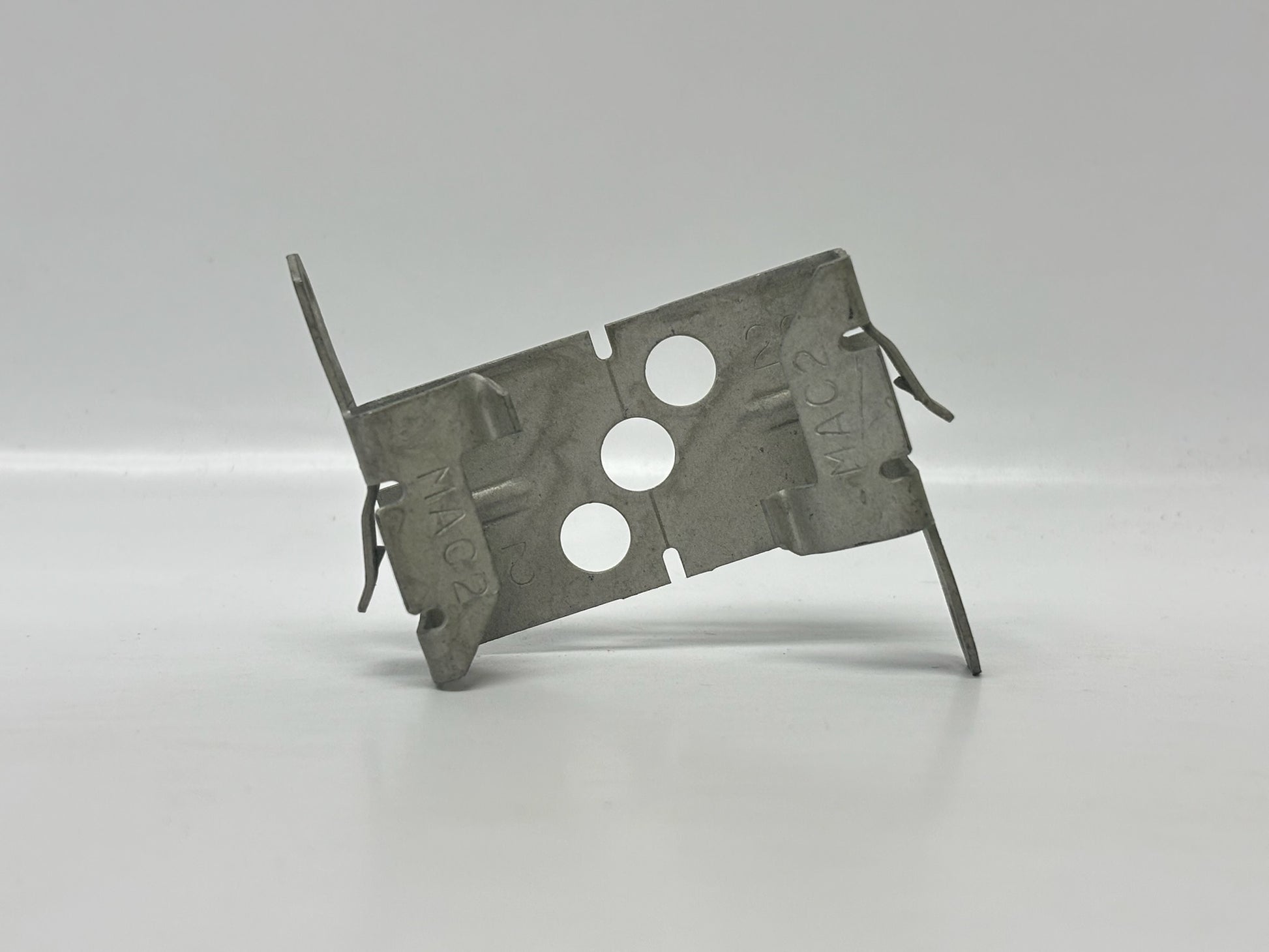 The MAC2 is a spring‑steel snap‑in support clip for MC/AC cable runs, designed to mount to metal or wood studs, or beam flanges. It supports 14‑2 to 10‑3 MC/AC cable sizes and installs without tools. It has stabilizer legs for stability and complies with NEC 300.4(d), positioning cable at least 1¼″ from stud face. The clip even “snaps in half” to be used as two single‑run clips when needed.