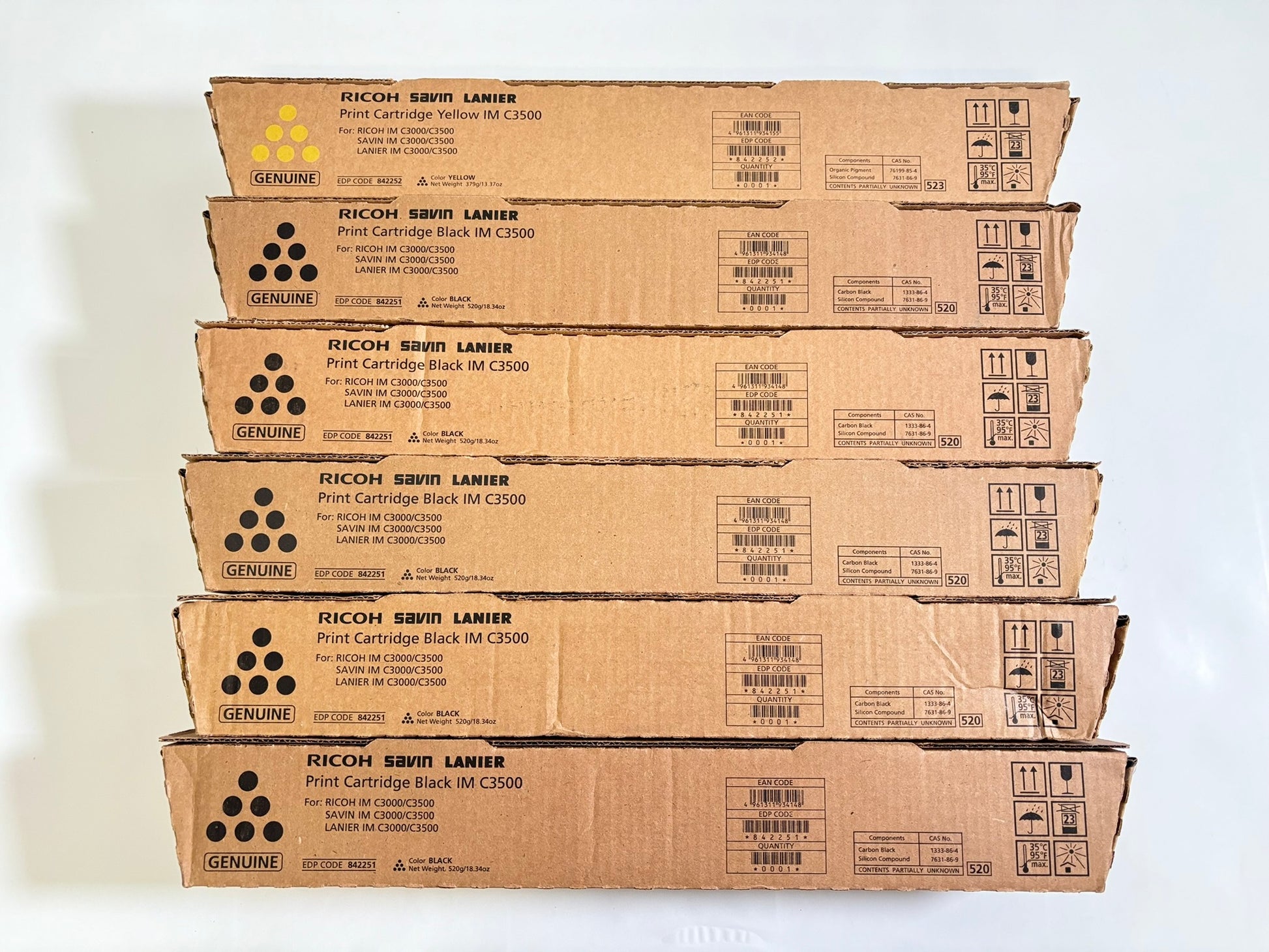 6 New OEM Ricoh IMC3500, C3000 Yellow & Black Toners 842251 (x1), 842252 (x5)