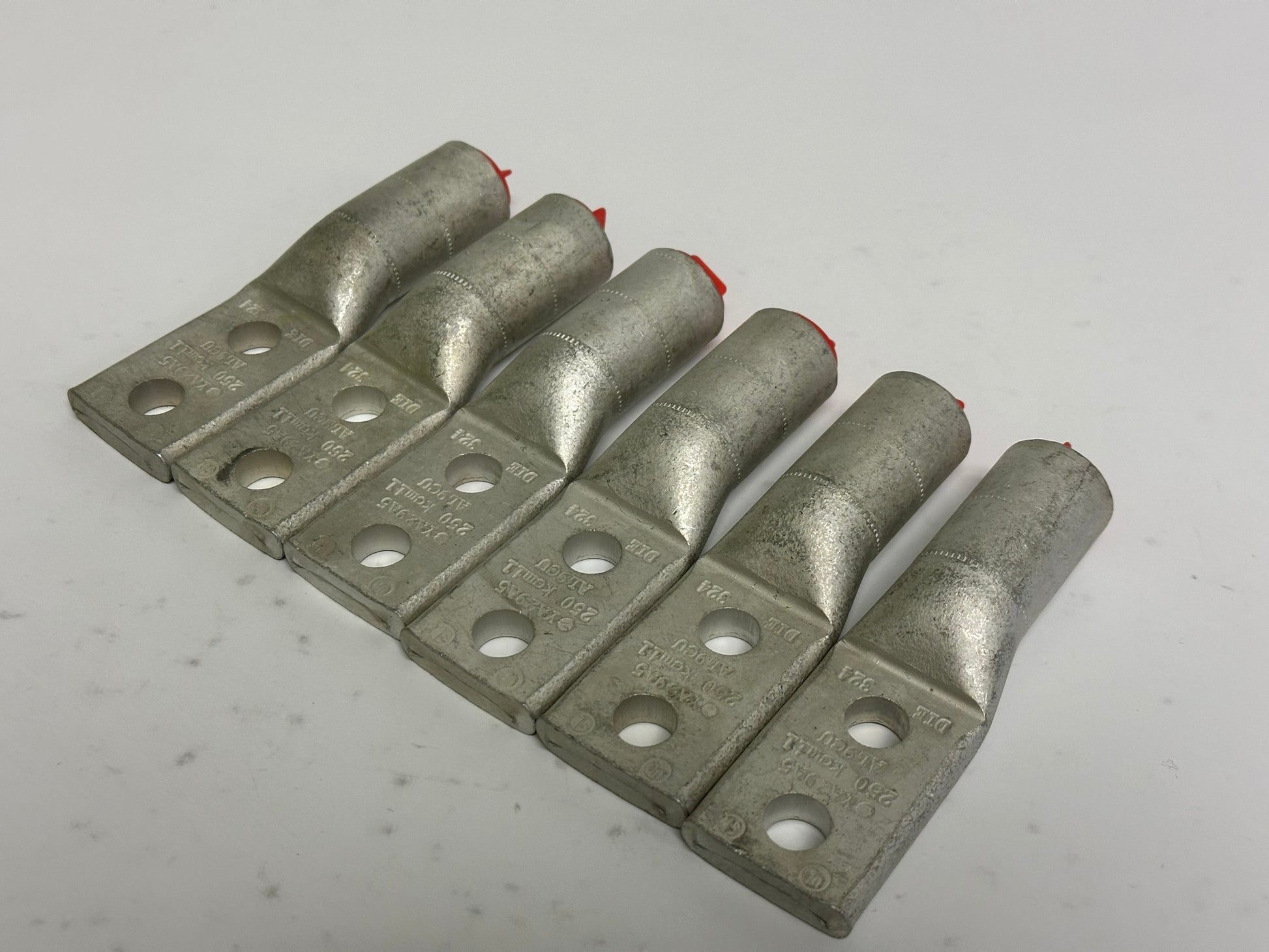 The 6 PK Burndy (YA29A5) AL Compression Terminals are designed for use in electrical systems that require secure and reliable connections. These two-hole terminals feature a 3/8" stud size and 1" hole spacing, making them ideal for connecting aluminum (AL) and copper (CU) wires in industrial applications. To use, strip the wire ends and insert them into the terminal, ensuring proper alignment with the holes for a secure fit. Once the wire is positioned, use a compression tool to crimp the terminal, creating a strong, solderless connection. These terminals are built for long-lasting performance and can handle high-current loads, making them an excellent choice for power distribution and other electrical needs.