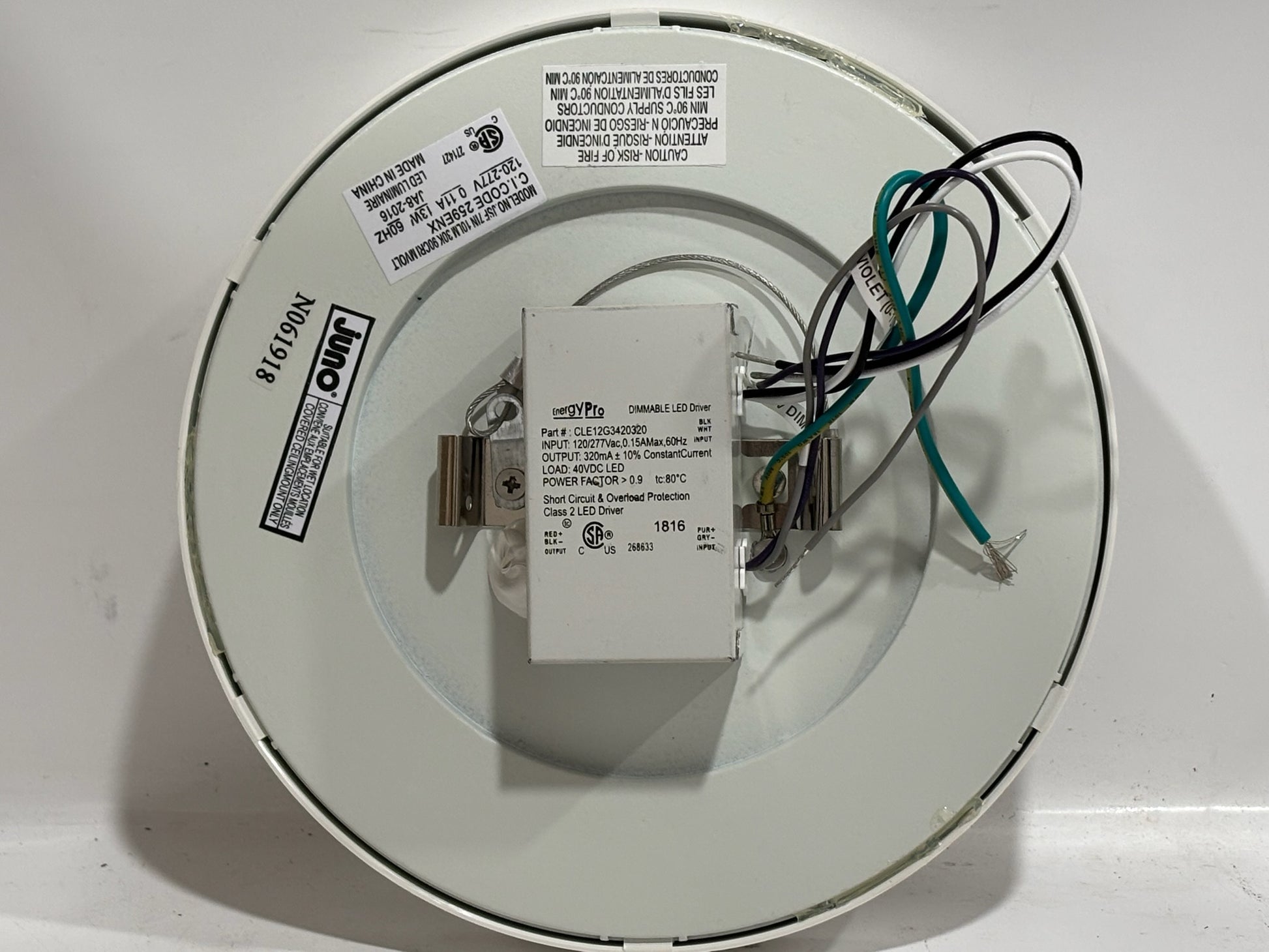 The Juno 259ENX is a 7-inch round SlimForm surface-mount LED downlight delivering approximately 1,000 lumens with 90+ CRI and fixed 3,000 K color temperature. It features a multi-volt driver (120–277 V) with 0–10 V dimming compatibility and is ENERGY STAR and wet-location rated. Built with a low-profile design and white finish, it’s ideal for commercial, retail, hospitality, and residential settings. This durable fixture combines hassle-free installation with high-quality illumination.
