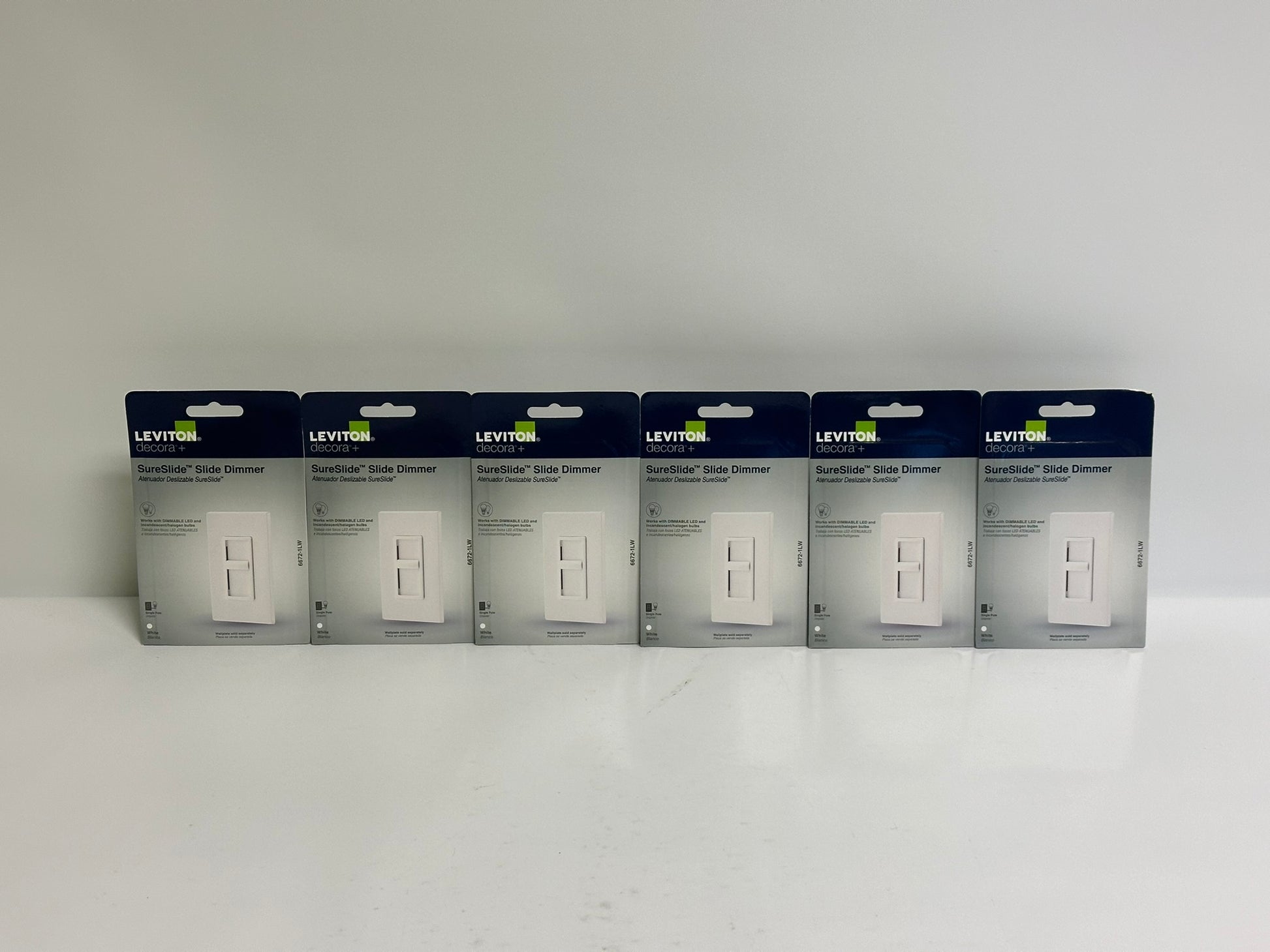 The 6 PK Leviton (6672) Dimmer Switch is designed for controlling dimmable LED and incandescent bulbs. This switch allows users to adjust the brightness of their lighting, providing greater energy efficiency and ambiance control. Compatible with a wide range of dimmable LED and incandescent bulbs, the Leviton dimmer ensures smooth, flicker-free performance. The 6-pack offers a cost-effective solution for multiple installations, making it ideal for residential and commercial applications where lighting control and energy savings are desired.