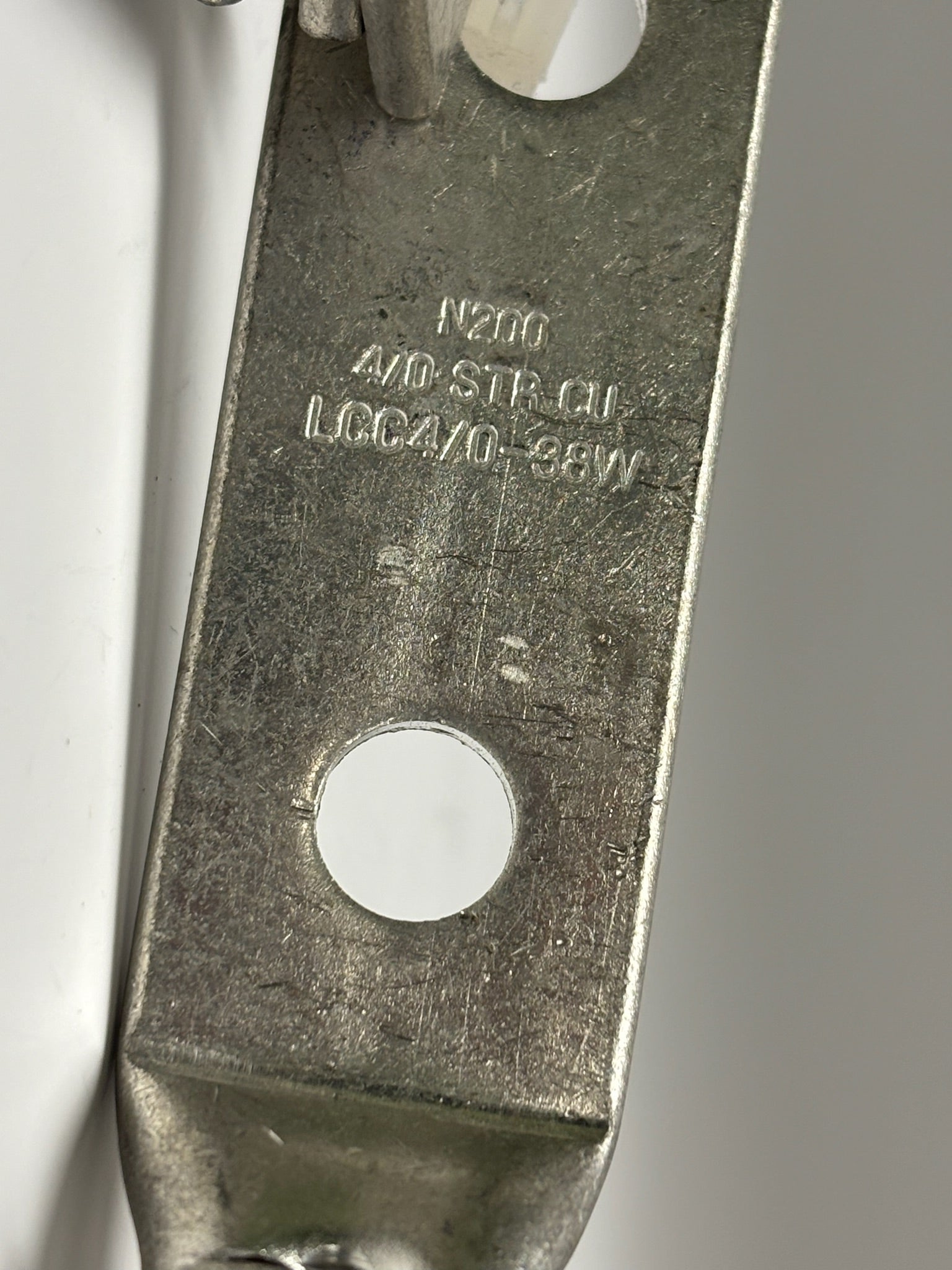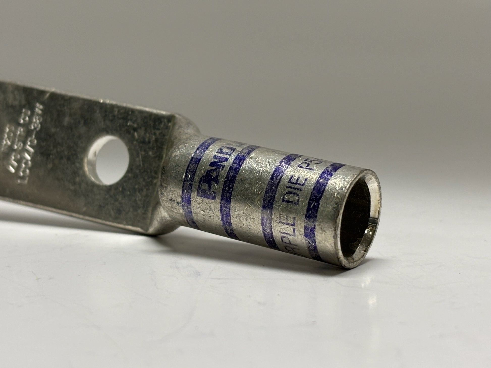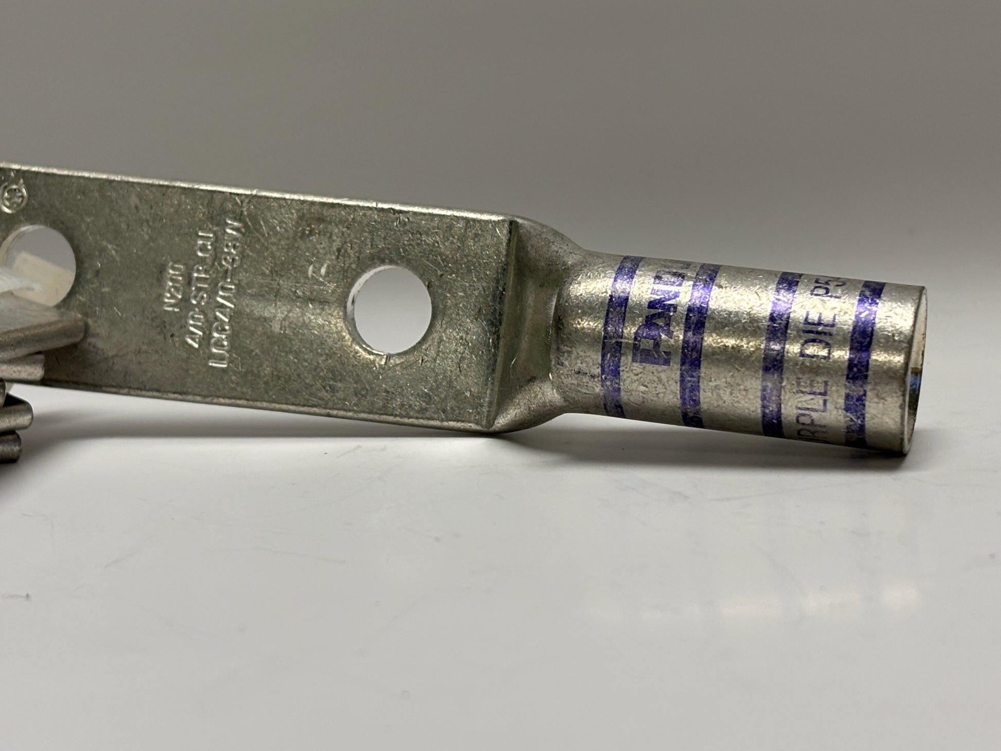 The Panduit LCC4/0-38W-X is a 2-hole, long barrel copper compression lug for 4/0 AWG stranded wire. It features a tin-plated finish for corrosion resistance and a built-in inspection window for proper crimp verification. Designed for 3/8" studs with 1.75" spacing, it ensures strong, reliable electrical connections. Rated for up to 35 kV and 90°C, this UL and CSA certified lug is ideal for industrial and utility applications.