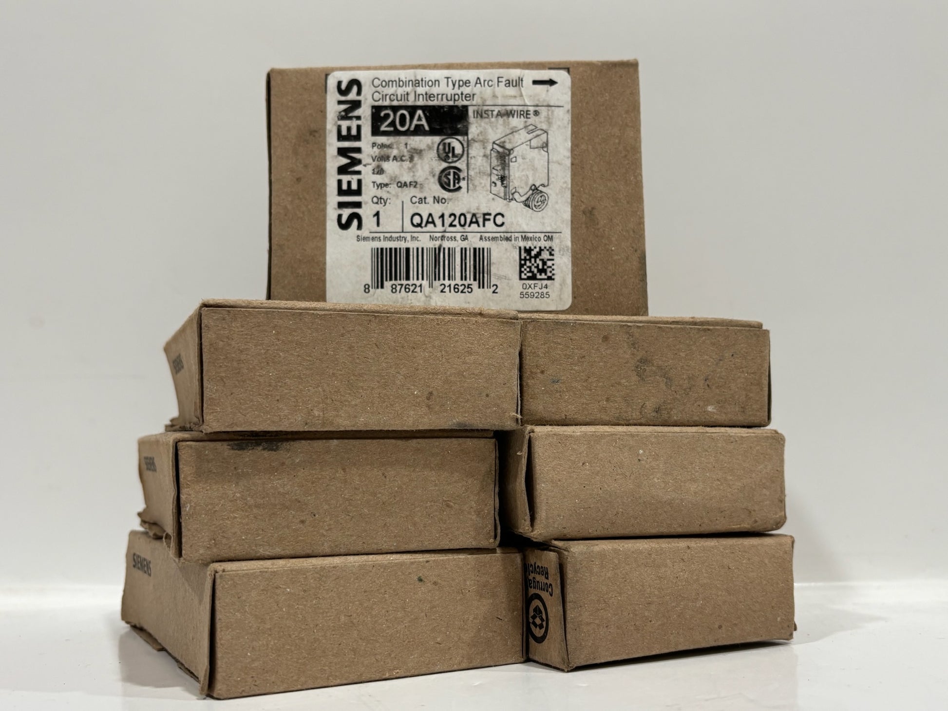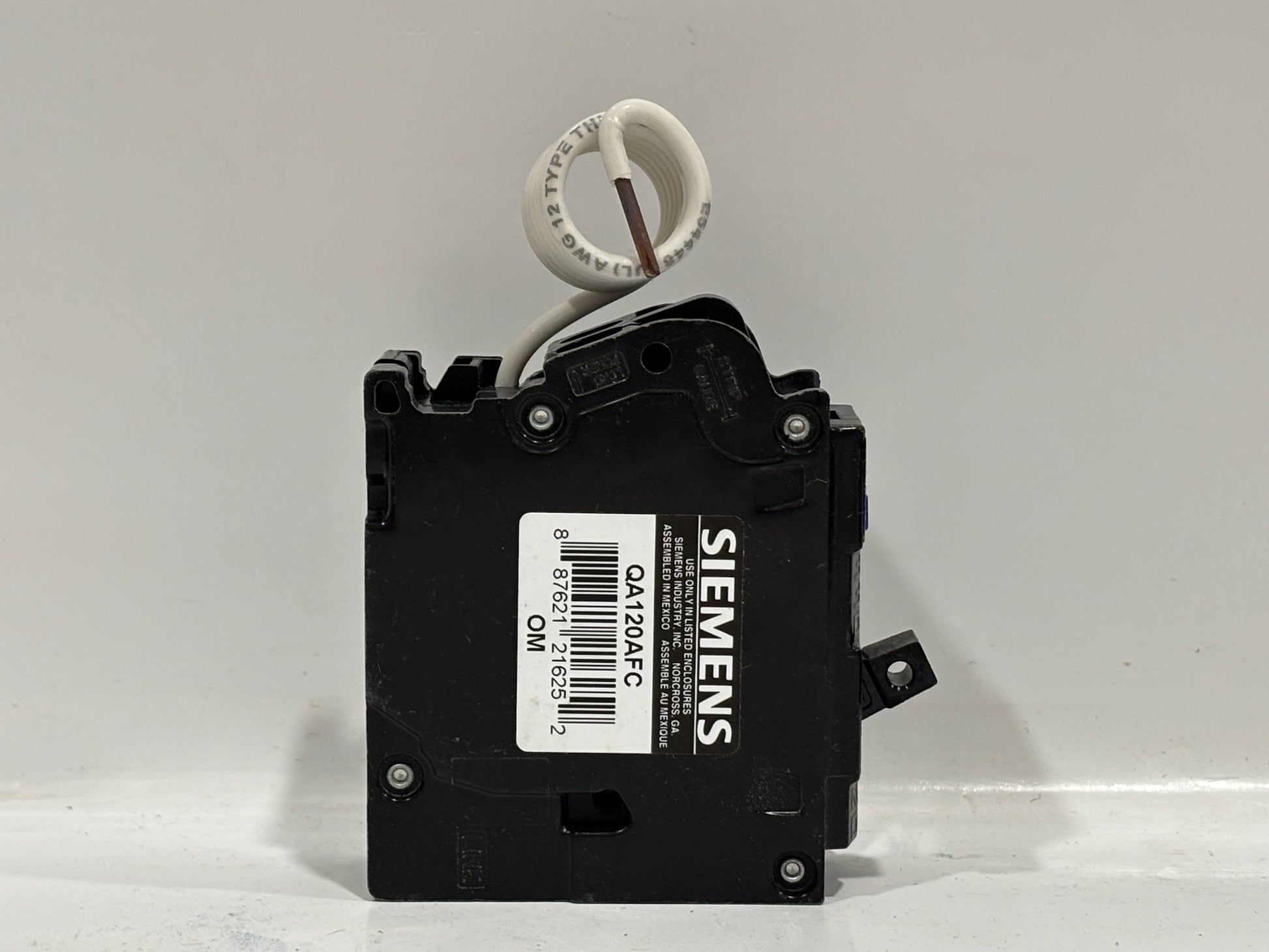 The Siemens QA120AFC is a 20-amp single-pole arc fault circuit interrupter breaker designed to protect against electrical fires caused by arc faults. It fits Siemens load centers and offers easy plug-in installation. The breaker supports 120 volts and has LED indicators for quick diagnostics. It is UL listed and suitable for residential and commercial use. This device enhances electrical safety by detecting both series and parallel arc faults.