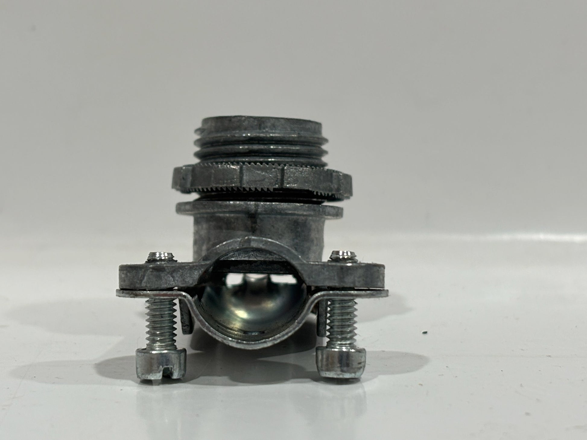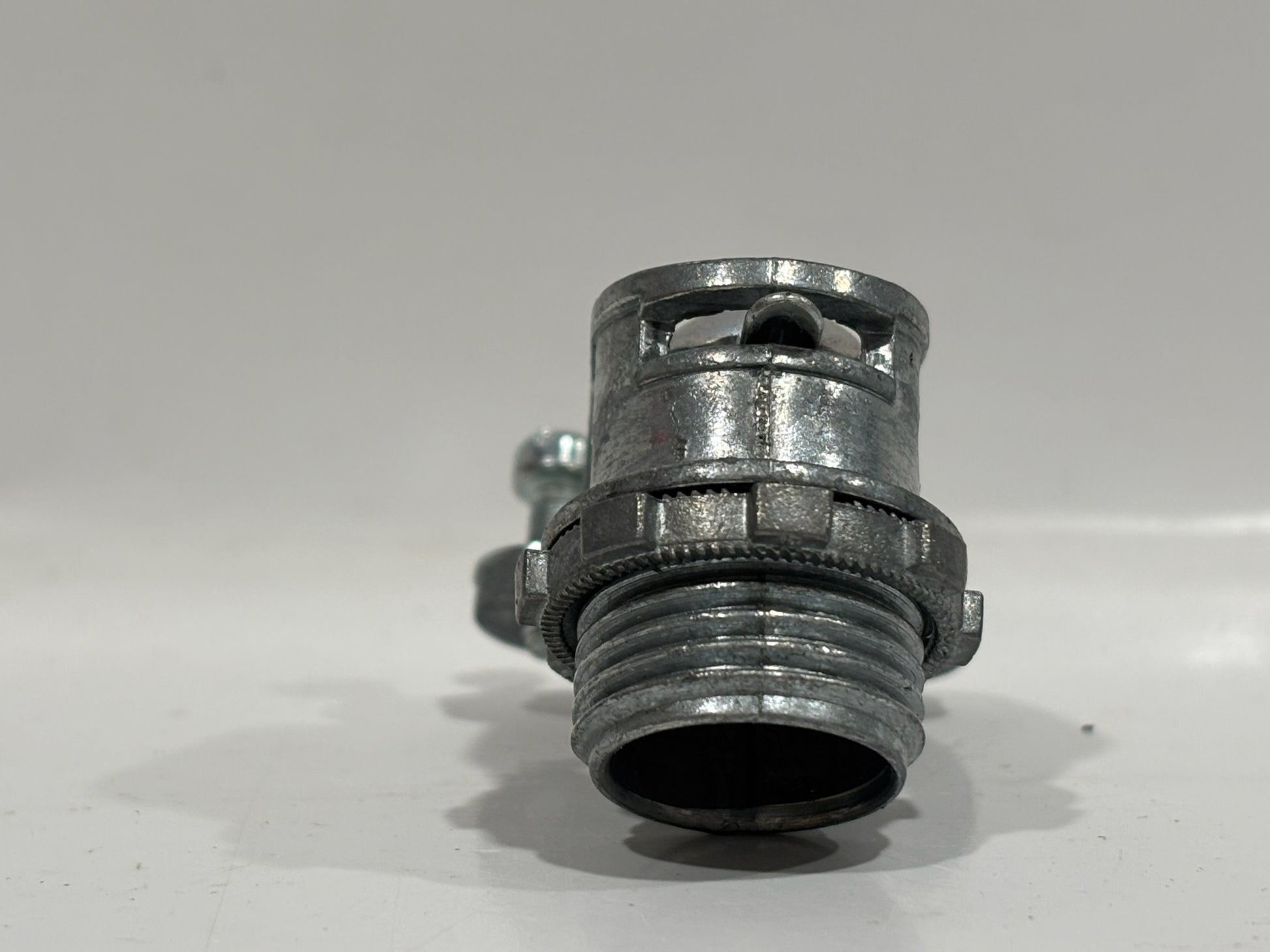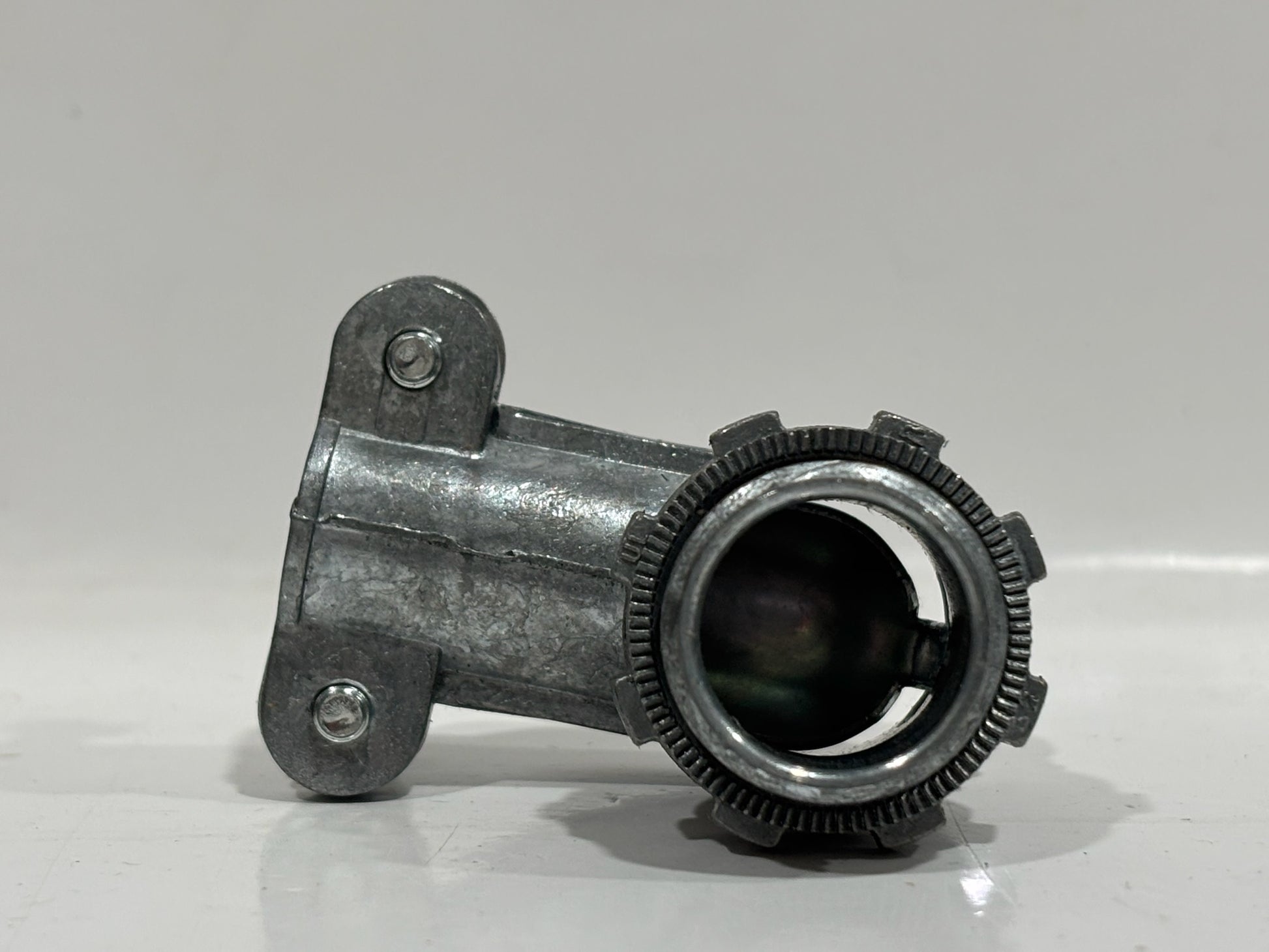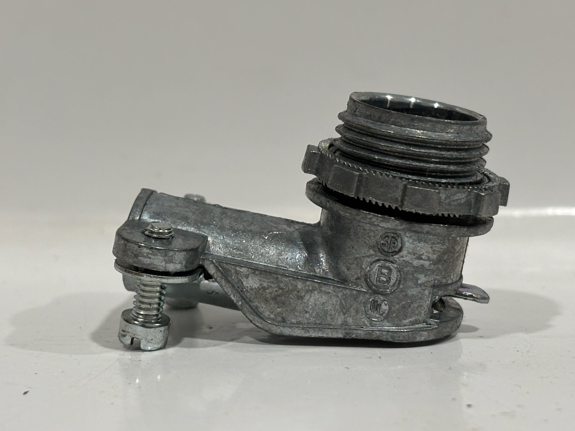 The Bridgeport 801-DC2 is a 90° die-cast zinc connector designed for 3/8" flexible metal conduit (FMC) and MC/MCI-A cable. It features a two-screw clamp and cover design for a secure and reliable connection to boxes or enclosures. This connector fits 1/2" knockouts and supports cable diameters from 0.45" to 0.625". It is UL listed, CSA certified, and compliant with NEMA FB-1 and Federal specifications. Ideal for commercial or residential directional conduit runs.
