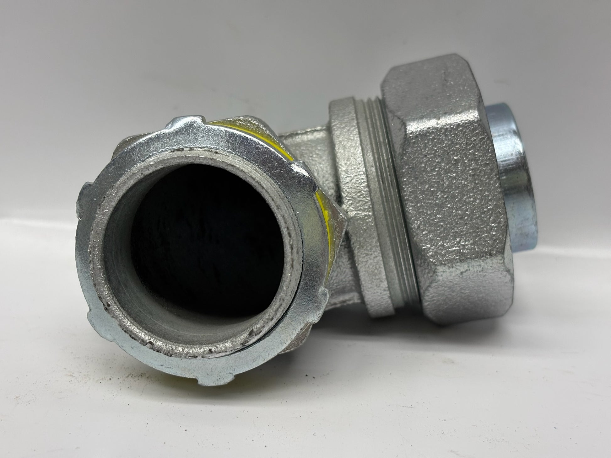 The Raco 3545 is a durable 90-degree liquidtight connector designed for secure termination of flexible metallic or non-metallic conduit. Its malleable iron construction with a zinc-electroplated finish provides excellent corrosion resistance in demanding environments.