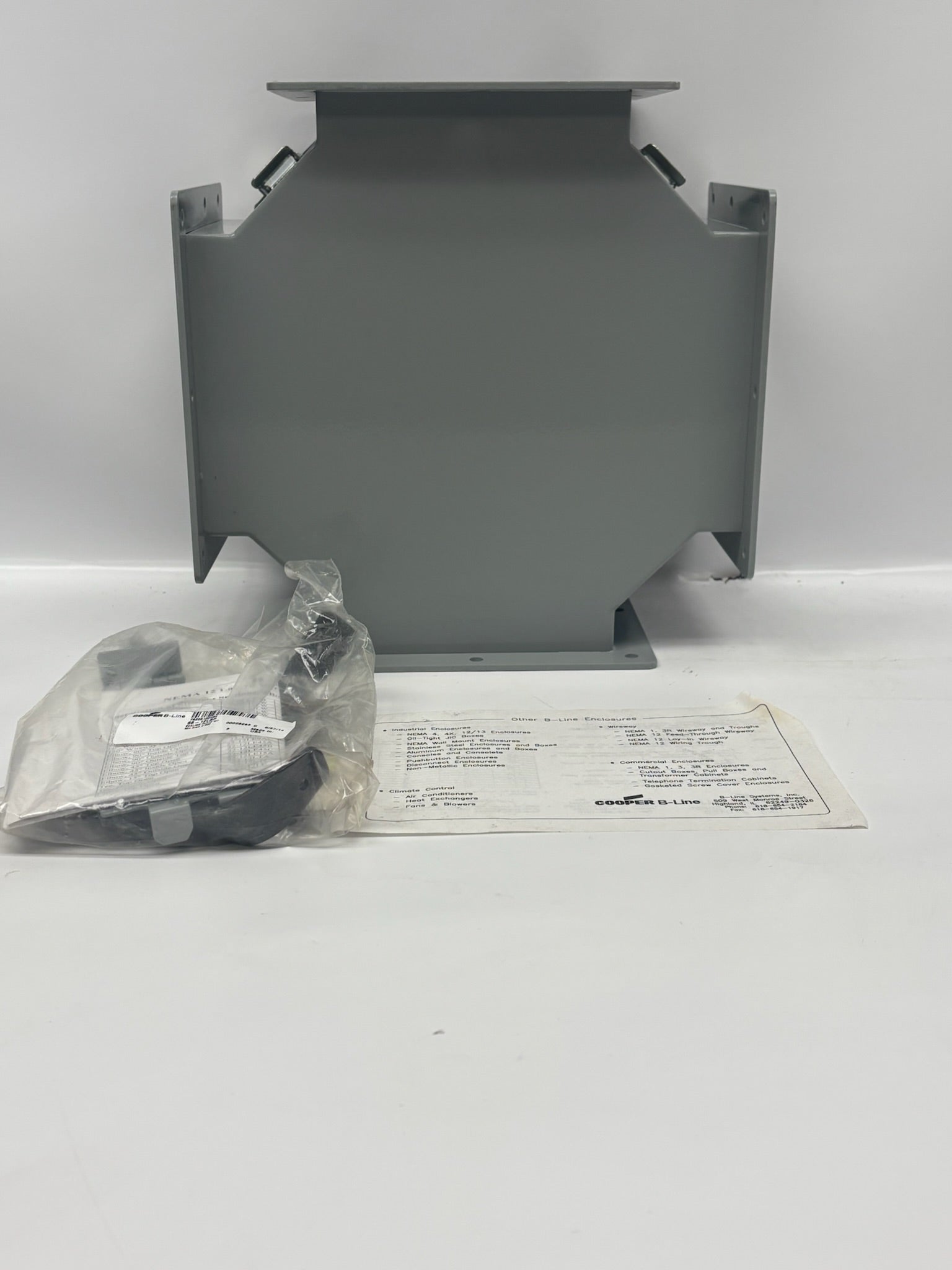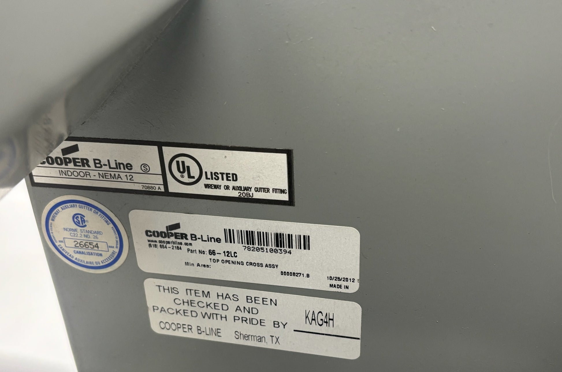 The 66‑12LC is a closure plate designed for use with the B‑Line series lay‑in wireway system sized at 6 inches high by 6 inches wide. It is fabricated from steel with a phosphate undercoat and a polyester powder‑coated finish in ANSI 61 gray. The component is rated for NEMA 12/IP54 environments, providing protection in indoor industrial settings against dust, dirt and light moisture. It measures approximately 11.5 inches in length by 6 inches width by 6 inches height and includes sealing plate kits to maintain the integrity of the enclosure when the run of wireway ends. This product is suited for commercial or industrial installations where a clean, sealed termination of a wireway run is required.
