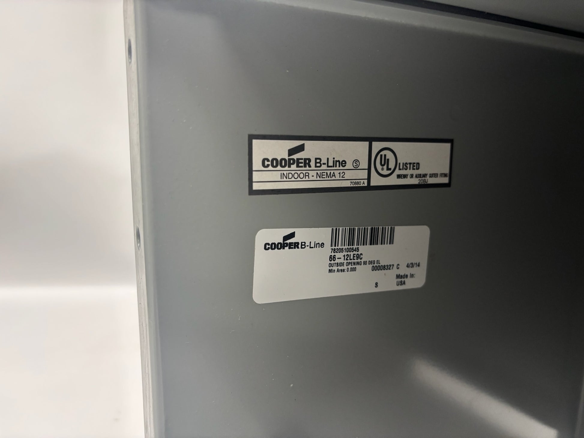 The B-Line 66-12LE9C is a 90° elbow fitting for the B-Line lay-in wireway system, sized for 6 inches high by 6 inches wide, with an approximate length of 9.44 inches. It is made of 14-gauge steel with a phosphate undercoat and a polyester powder-coated ANSI 61 gray finish. The elbow is rated for NEMA 12/IP54 environments, providing protection against dust, dirt, and dripping non-corrosive liquids in indoor industrial settings. The outside-opening orientation allows the bend to direct cables externally as needed. A sealing plate kit is included to maintain the rated integrity of the wireway system at the bend.