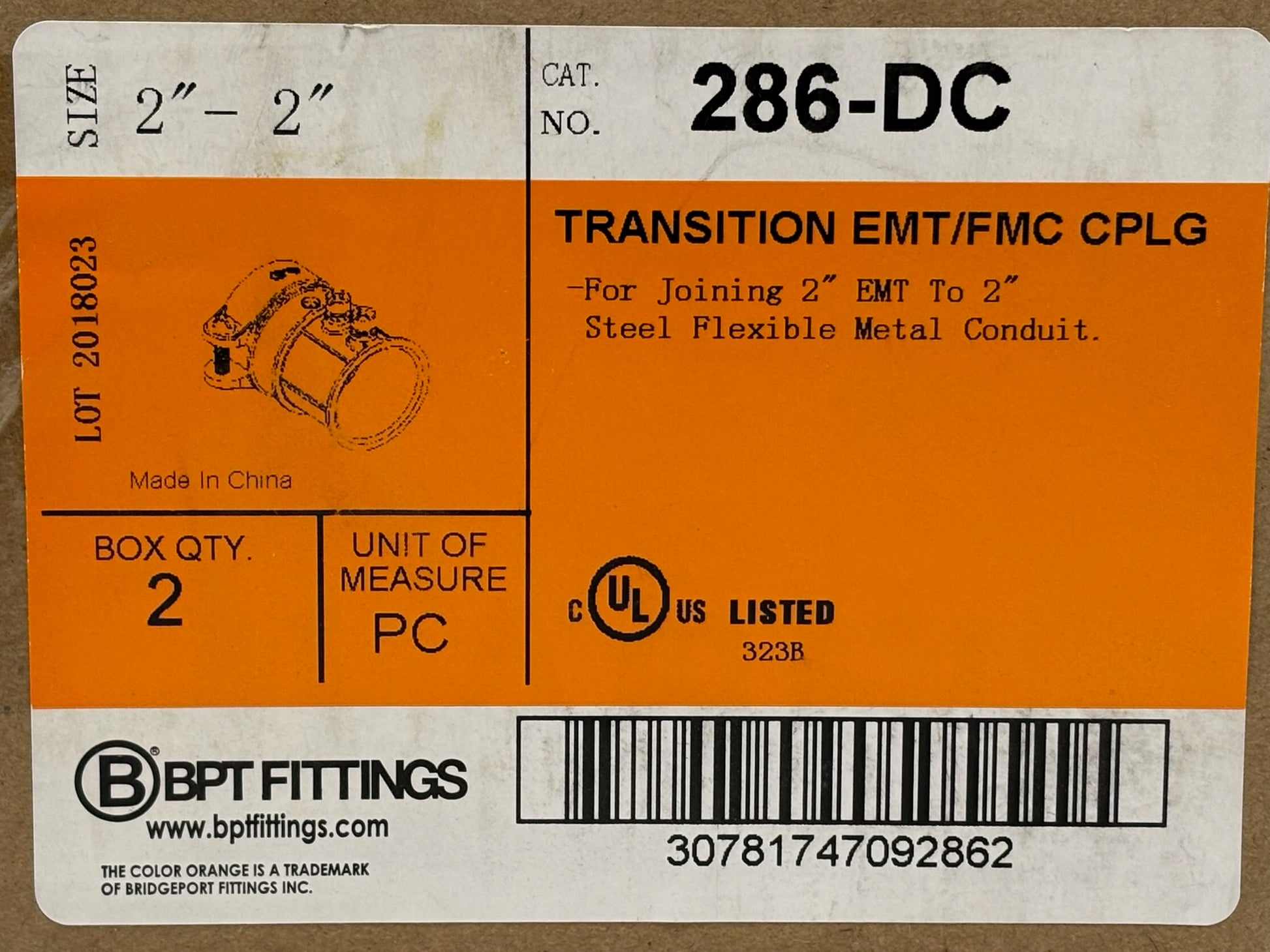 The Bridgeport 286‑DC is a 2‑inch EMT to FMC (flexible metal conduit) transition coupling made of die‑cast zinc. It features a ball‑burnished, mirror‑smooth finish and a set screw to secure the EMT side. Its dimensions are approximately 2.69″ outer diameter by 3.5″ length. This coupling is UL 514B listed and provides a reliable, code‑compliant way to transition between EMT and FMC conduit systems.