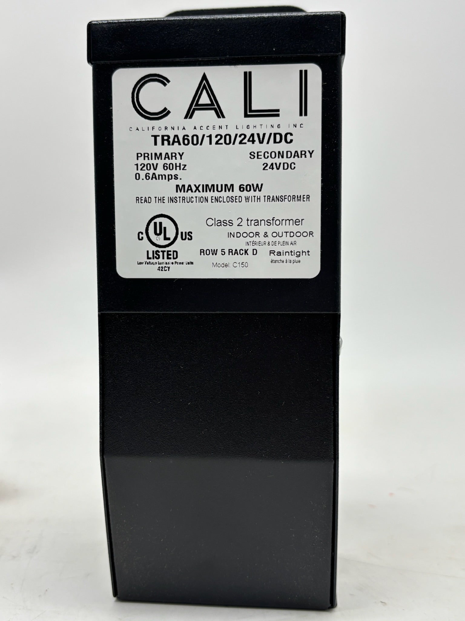The CALI TRA60/120/24V/DC is a reliable, compact outdoor LED lighting transformer designed to convert standard 120V AC power to a stable 24V DC output, delivering up to 60 watts of power. Engineered for efficiency and safety, this UL-listed transformer ensures consistent voltage for low-voltage LED systems such as landscape lighting, under-cabinet illumination, and architectural accents. Its durable construction suits various indoor and outdoor installations, providing long-lasting performance even in challenging environments. The transformer includes mounting hardware for straightforward installation and supports a wide range of 24V DC LED fixtures, making it an ideal choice for both residential and commercial lighting projects. With its compact design and dependable operation, the CALI TRA60/120/24V/DC transformer helps maintain optimal lighting performance while protecting your system from voltage fluctuations.