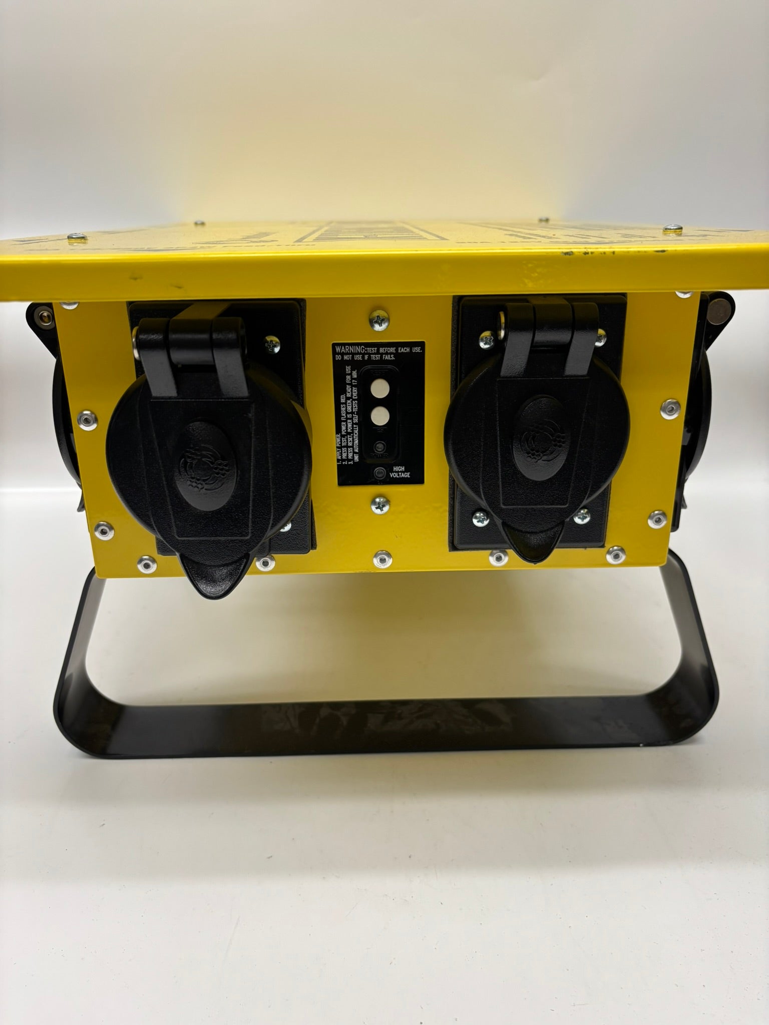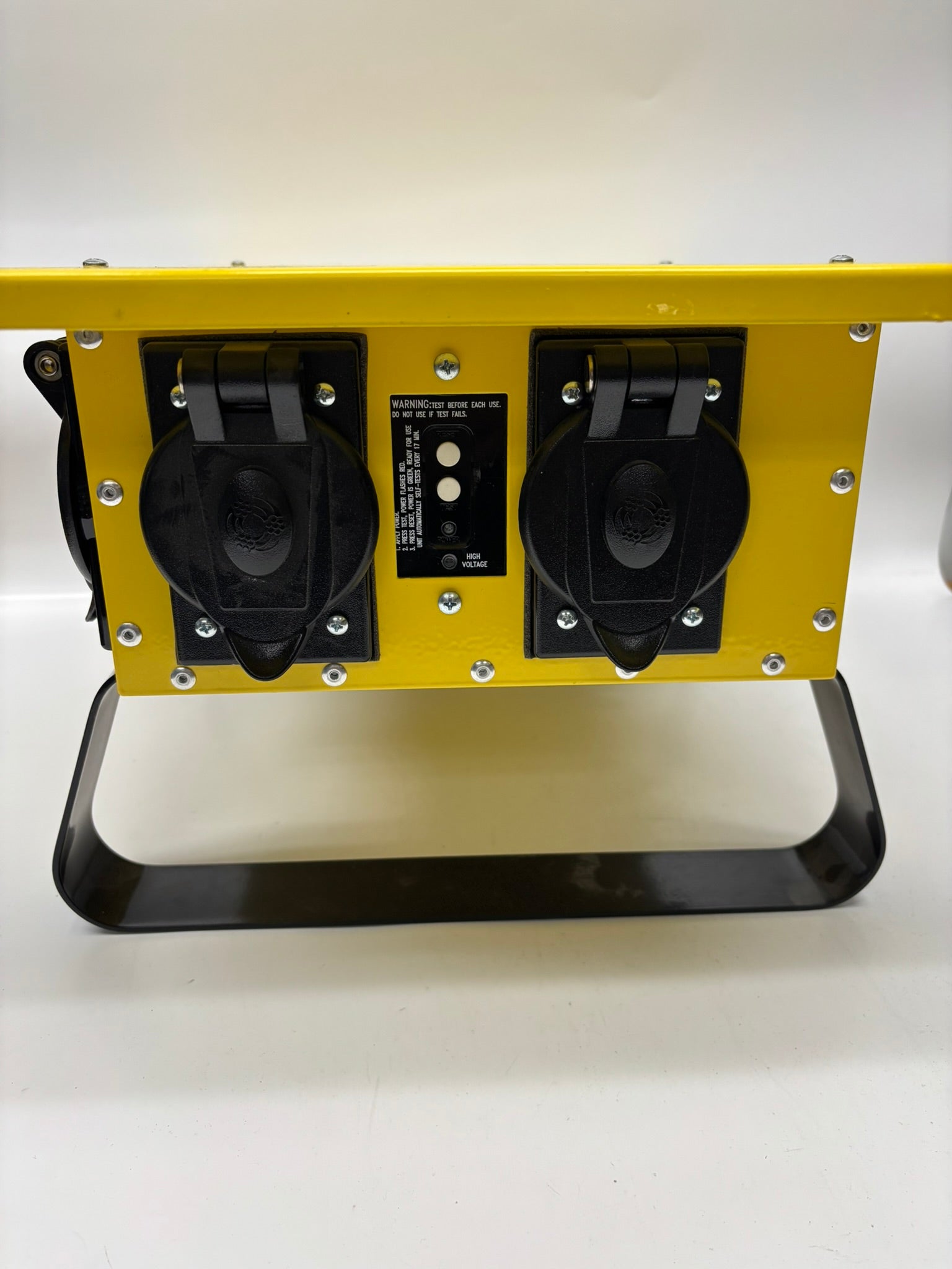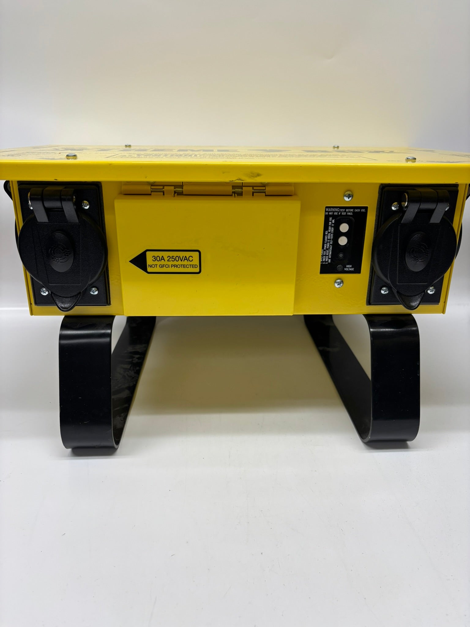 The 50A 125/250V Temporary Power X-Treme Box with 6 L5-20 Twist-Lock outlets and a sled base is a rugged, job-site-rated power distribution unit designed to safely deliver temporary power in demanding environments such as construction sites or outdoor events. It features a 50-amp inlet and distributes power through six NEMA L5-20 twist-lock receptacles, ensuring secure, weather-resistant connections and enhanced safety with integrated circuit breakers and GFCI protection.
