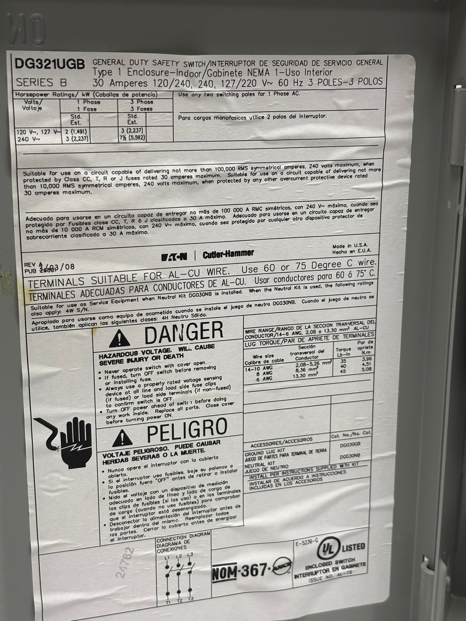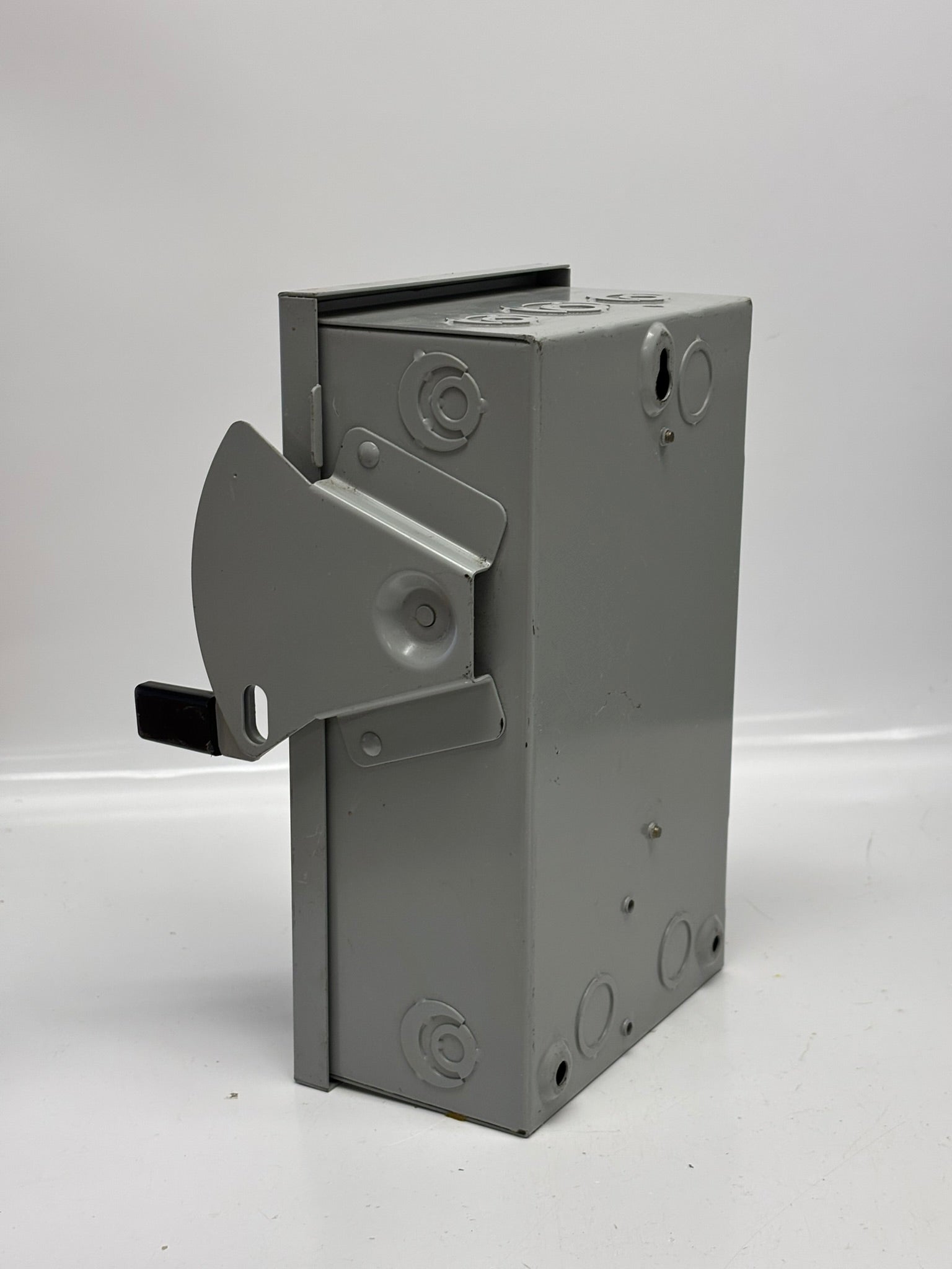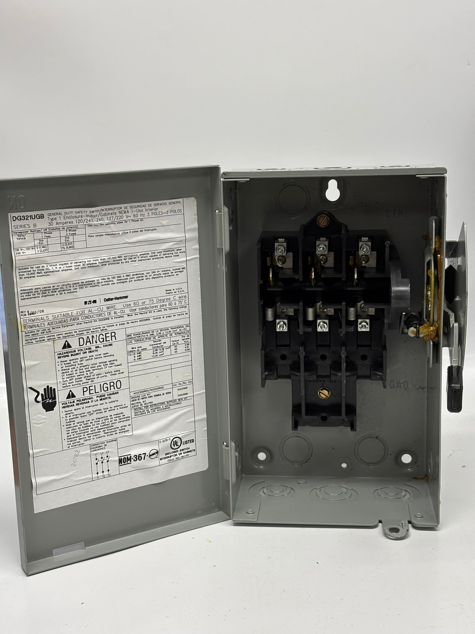The Eaton General Duty Non-Fusible Safety Switch is a single-throw, three-pole, three-wire device rated for 30 amps and 240 volts, designed for safe and reliable indoor power disconnection. Housed in a NEMA 1 painted steel enclosure, it provides durable protection in general-purpose indoor environments. This switch offers a non-fusible design ideal for applications not requiring overcurrent protection.