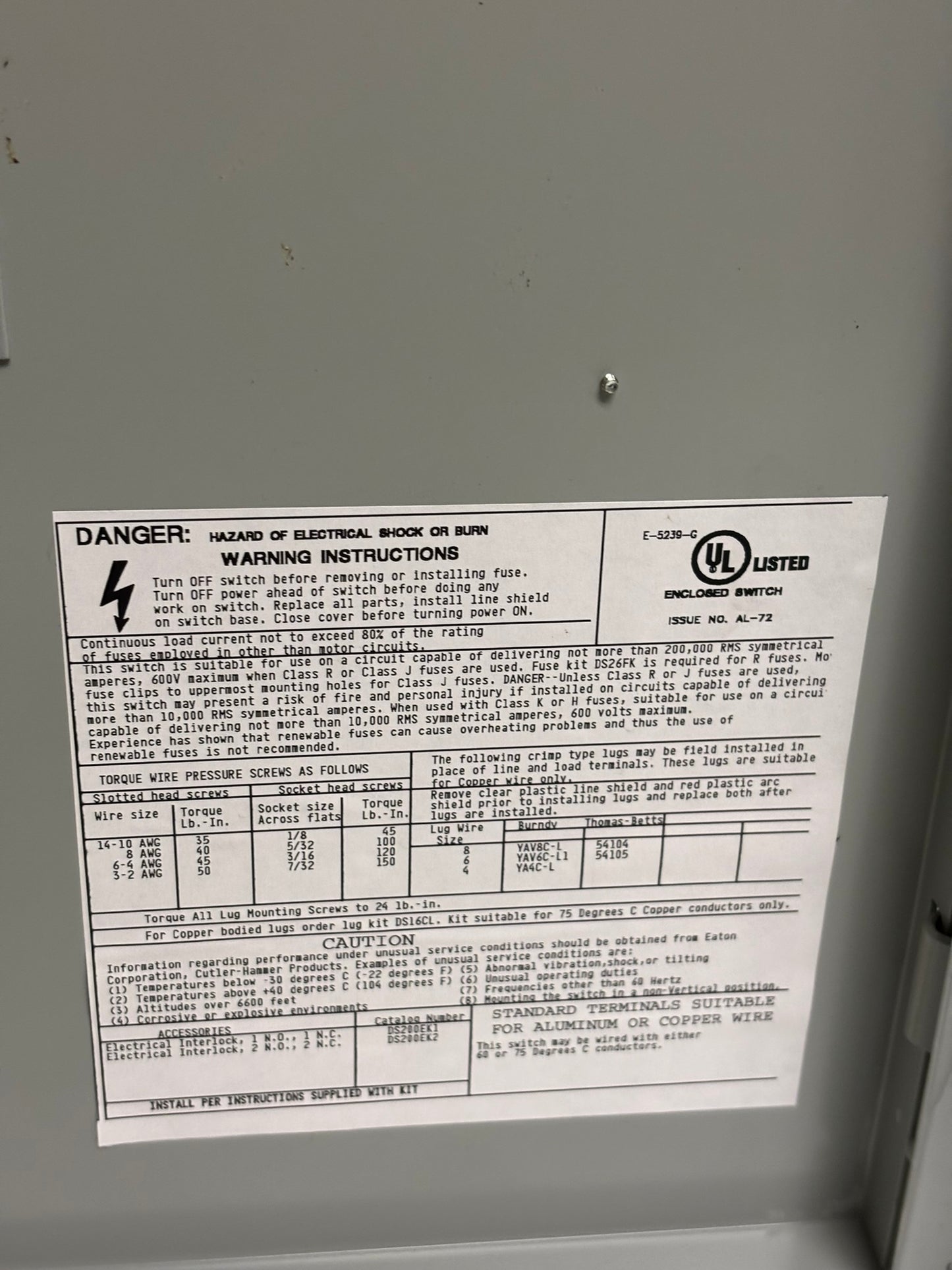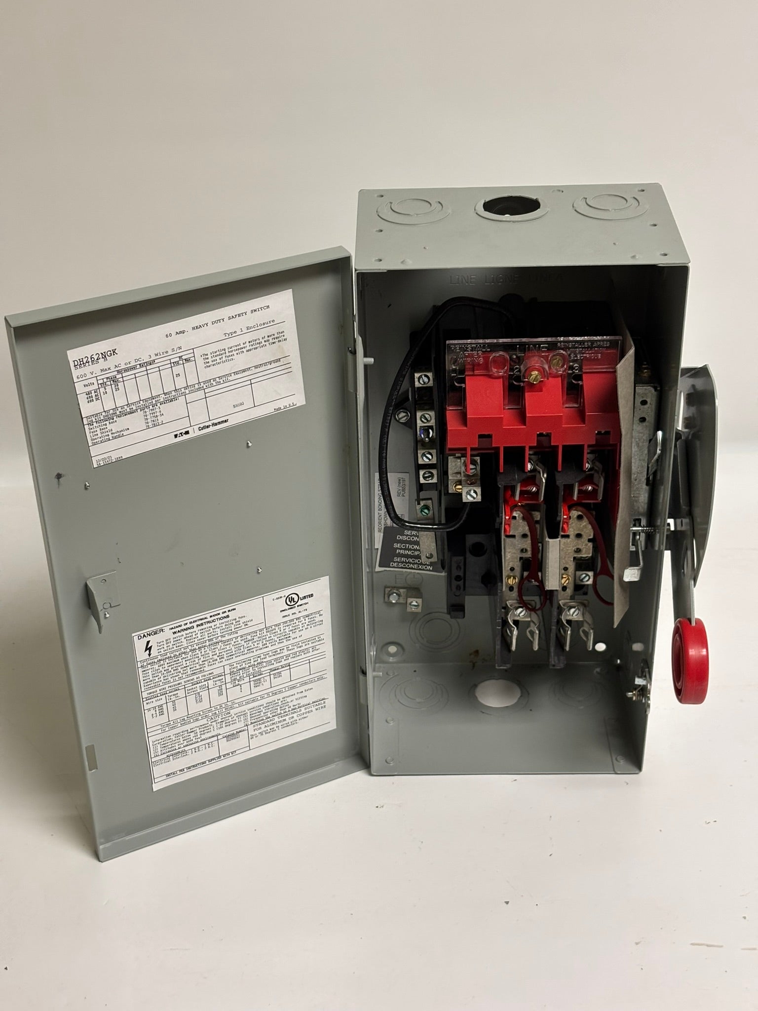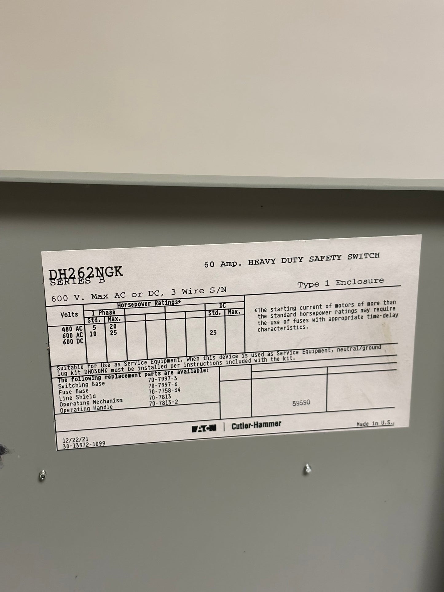 The Eaton heavy-duty single-throw fused safety switch is a 60 Amp, two-pole, three-wire unit designed for reliable circuit protection in industrial and commercial settings. Rated for 600V with Class H fusing and a fusible neutral, it offers safe disconnecting and protection of electrical circuits. With a maximum horsepower rating of 20, 25 hp (1PH @ 480, 600 V), and a conductor range of #14 to #2 Cu/Al, this switch is ideal for a variety of high-demand applications.