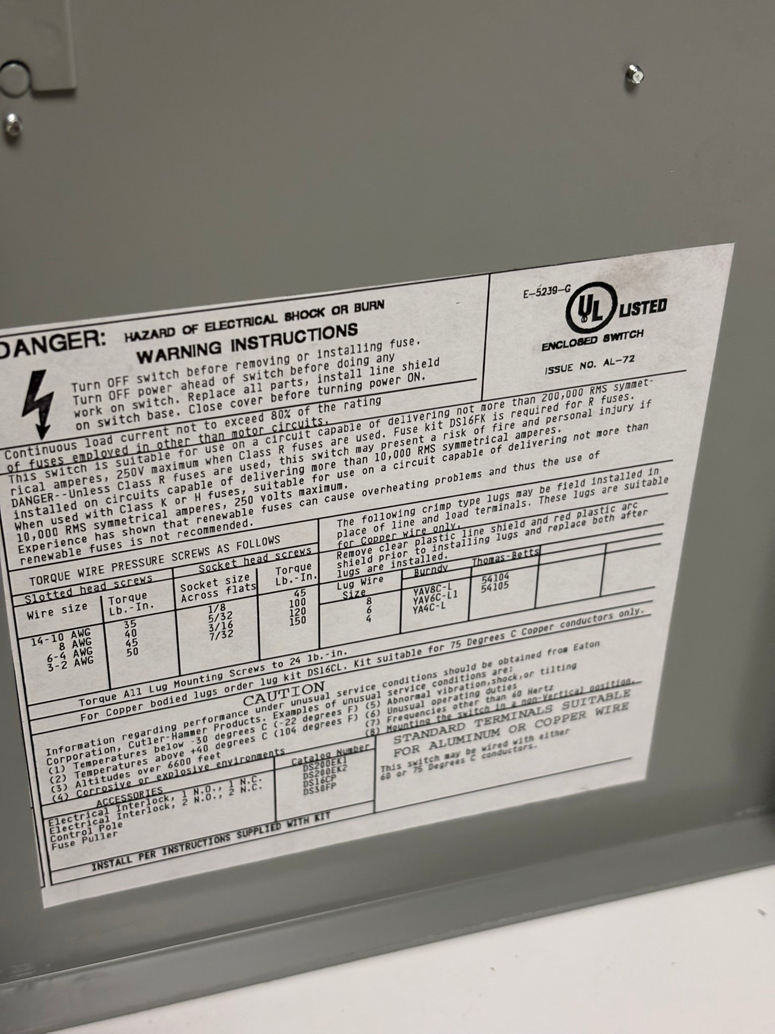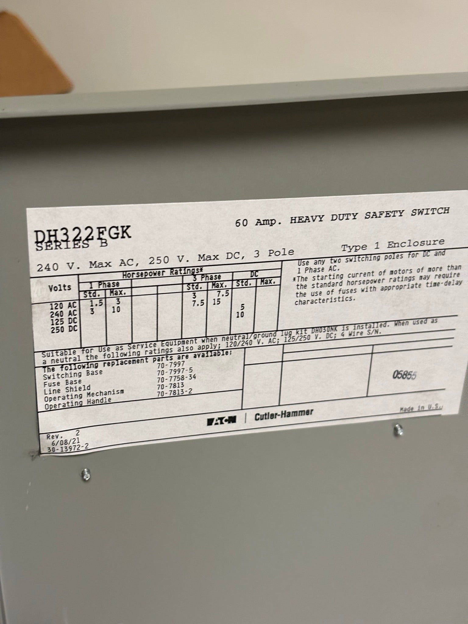 The Eaton Enhanced Visible Blade Single-Throw Safety Switch, 60 Amp, is designed for safe and reliable circuit protection in industrial and commercial applications. Featuring a NEMA 1 painted steel enclosure and Class H fusing, this three-pole, three-wire switch operates at 240V and provides enhanced visibility of the blade for added safety during operation. With a maximum horsepower rating of 3 HP at 240V and up to 15 HP across various voltage configurations (1, 3PH @ Std/TD/250 Vdc), it supports #14 to #2 Cu/Al conductors for versatile installation.